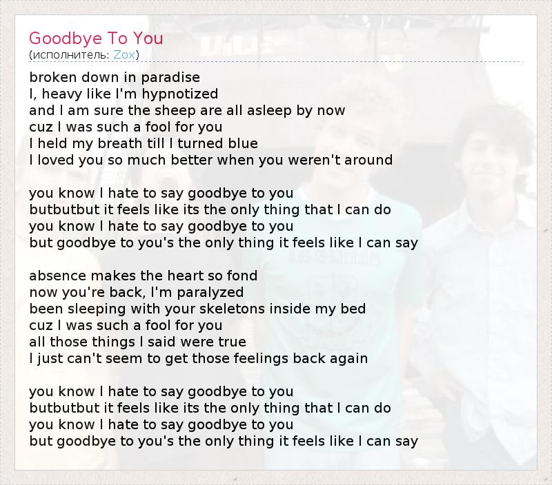 broken down in paradise I, heavy like I'm hypnotized and I am sure the sheep are all asleep by now cuz I was such a fool for you I held my breath till I turned blue I loved you so much better when you weren't around you know I hate to say goodbye to you butbutbut it feels like its the only thing that I can do you know I hate to say goodbye to you but goodbye to you's the only thing it feels like I can say absence makes the heart so fond now you're back, I'm paralyzed been sleeping with your skeletons inside my bed cuz I was such a fool for you all those things I said were true I just can't seem to get those feelings back again you know I hate to say goodbye to you butbutbut it feels like its the only thing that I can do you know I hate to say goodbye to you but goodbye to you's the only thing it feels like I can say