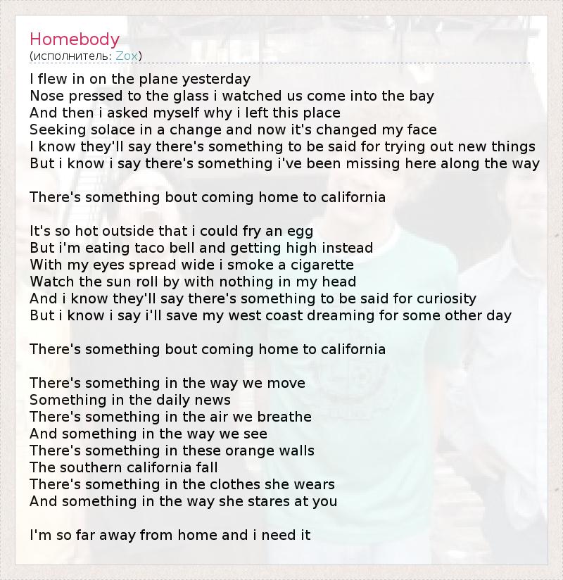 I flew in on the plane yesterday Nose pressed to the glass i watched us come into the bay And then i asked myself why i left this place Seeking solace in a change and now it's changed my face I know they'll say there's something to be said for trying out new things But i know i say there's something i've been missing here along the way There's something bout coming home to california It's so hot outside that i could fry an egg But i'm eating taco bell and getting high instead With my eyes spread wide i smoke a cigarette Watch the sun roll by with nothing in my head And i know they'll say there's something to be said for curiosity But i know i say i'll save my west coast dreaming for some other day There's something bout coming home to california There's something in the way we move Something in the daily news There's something in the air we breathe And something in the way we see There's something in these orange walls The southern california fall There's something in the clothes she wears And something in the way she stares at you I'm so far away from home and i need it