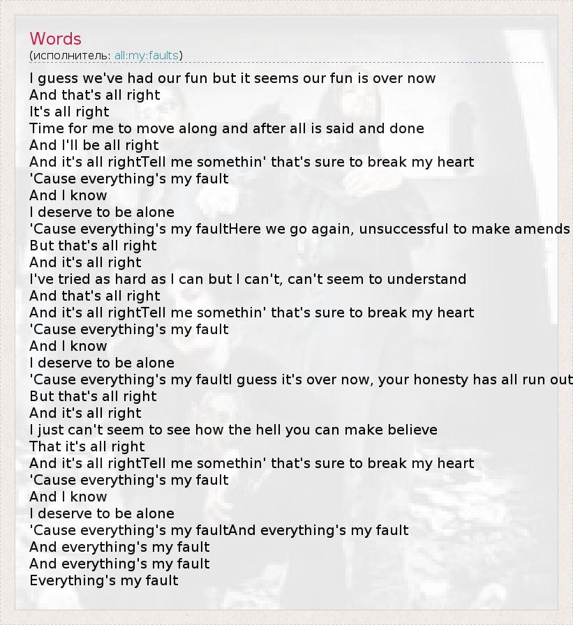'Cause everything's my faultI guess it's over now, your honesty has all run out