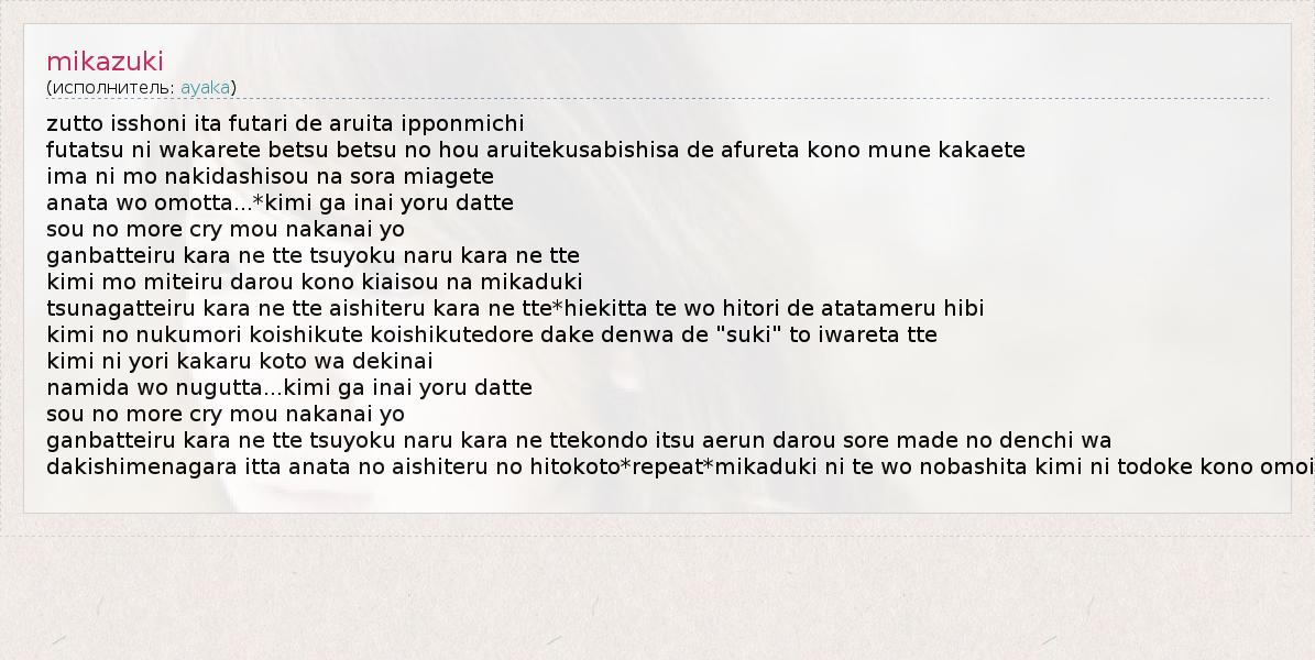 Это интересно:Пожалуйста, голосуйте за исправления тега на 絢香.Ayak’y, рожденную в 1987 году, просто не остановить. Первый контракт ayaka в музыкальном бизнесе был подписан еще в средней школе. Она очень быстро определилась с тем, что хочет стать профессиональной певицей, и ее первое выступление с группой состоялось в первый год старшей школы. Несмотря на то что девушка ограничилась... продолжение