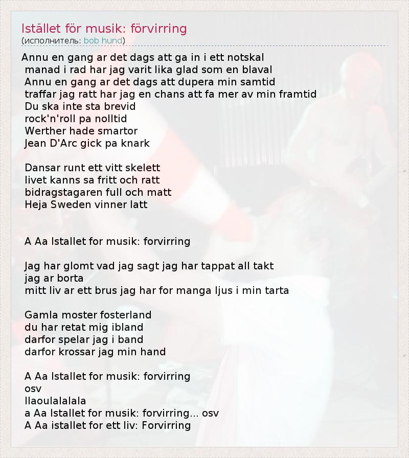 Annu en gang ar det dags att ga in i ett notskal manad i rad har jag varit lika glad som en blaval Annu en gang ar det dags att dupera min samtid traffar jag ratt har jag en chans att fa mer av min framtid Du ska inte sta brevid rock'n'roll pa nolltid Werther hade smartor Jean D'Arc gick pa knark Dansar runt ett vitt skelett livet kanns sa fritt och ratt bidragstagaren full och matt Heja Sweden vinner latt A Aa Istallet for musik: forvirring Jag har glomt vad jag sagt jag har tappat all takt jag ar borta mitt liv ar ett brus jag har for manga ljus i min tarta Gamla moster fosterland du har retat mig ibland darfor spelar jag i band darfor krossar jag min hand A Aa Istallet for musik: forvirring osv llaoulalalala a Aa Istallet for musik: forvirring... osv A Aa istallet for ett liv: Forvirring
