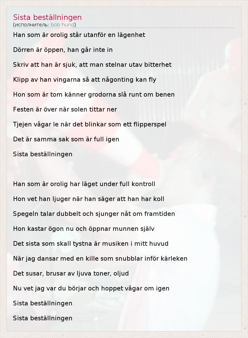 Han som är orolig står utanför en lägenhet Dörren är öppen, han går inte in Skriv att han är sjuk, att man stelnar utav bitterhet Klipp av han vingarna så att någonting kan fly Hon som är tom känner grodorna slå runt om benen Festen är över när solen tittar ner Tjejen vågar le när det blinkar som ett flipperspel Det är samma sak som är full igen Sista beställningen Han som är orolig har läget under full kontroll Hon vet han ljuger när han säger att han har koll Spegeln talar dubbelt och sjunger nåt om framtiden Hon kastar ögon nu och öppnar munnen själv Det sista som skall tystna är musiken i mitt huvud När jag dansar med en kille som snubblar inför kärleken Det susar, brusar av ljuva toner, oljud Nu vet jag var du börjar och hoppet vågar om igen Sista beställningen Sista beställningen