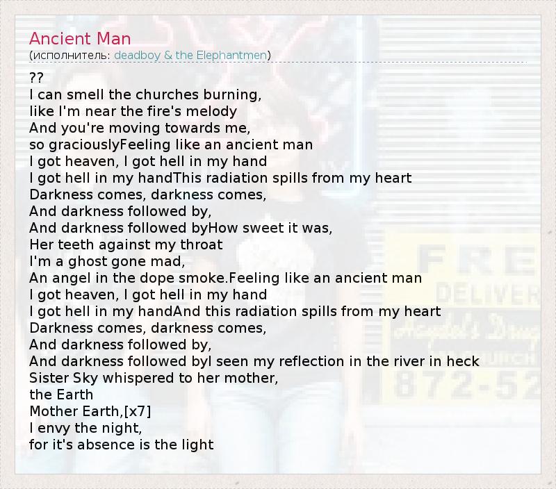 ?? I can smell the churches burning, like I'm near the fire's melody And you're moving towards me, so graciouslyFeeling like an ancient man I got heaven, I got hell in my hand I got hell in my handThis radiation spills from my heart Darkness comes, darkness comes, And darkness followed by, And darkness followed byHow sweet it was, Her teeth against my throat I'm a ghost gone mad, An angel in the dope smoke.Feeling like an ancient man I got heaven, I got hell in my hand I got hell in my handAnd this radiation spills from my heart Darkness comes, darkness comes, And darkness followed by, And darkness followed byI seen my reflection in the river in heck Sister Sky whispered to her mother, the Earth Mother Earth,[x7] I envy the night, for it's absence is the light