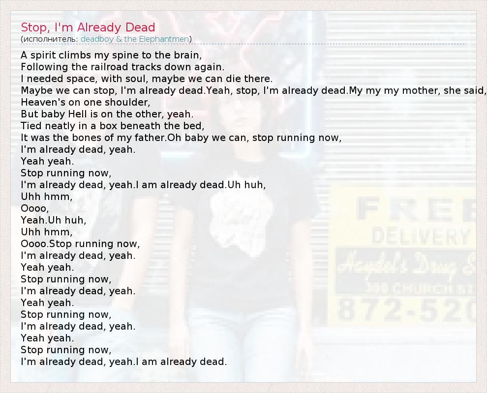 A spirit climbs my spine to the brain, Following the railroad tracks down again. I needed space, with soul, maybe we can die there. Maybe we can stop, I'm already dead.Yeah, stop, I'm already dead.My my my mother, she said, Heaven's on one shoulder, But baby Hell is on the other, yeah. Tied neatly in a box beneath the bed, It was the bones of my father.Oh baby we can, stop running now, I'm already dead, yeah. Yeah yeah. Stop running now, I'm already dead, yeah.I am already dead.Uh huh, Uhh hmm, Oooo, Yeah.Uh huh, Uhh hmm, Oooo.Stop running now, I'm already dead, yeah. Yeah yeah. Stop running now, I'm already dead, yeah. Yeah yeah. Stop running now, I'm already dead, yeah. Yeah yeah. Stop running now, I'm already dead, yeah.I am already dead.