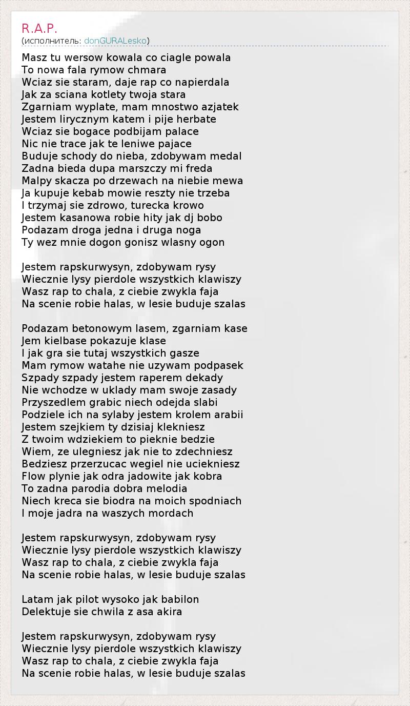 Masz tu wersow kowala co ciagle powala To nowa fala rymow chmara Wciaz sie staram, daje rap co napierdala Jak za sciana kotlety twoja stara Zgarniam wyplate, mam mnostwo azjatek Jestem lirycznym katem i pije herbate Wciaz sie bogace podbijam palace Nic nie trace jak te leniwe pajace Buduje schody do nieba, zdobywam medal Zadna bieda dupa marszczy mi freda Malpy skacza po drzewach na niebie mewa Ja kupuje kebab mowie reszty nie trzeba I trzymaj sie zdrowo, turecka krowo Jestem kasanowa robie hity jak dj bobo Podazam droga jedna i druga noga Ty wez mnie dogon gonisz wlasny ogon Jestem rapskurwysyn, zdobywam rysy Wiecznie lysy pierdole wszystkich klawiszy Wasz rap to chala, z ciebie zwykla faja Na scenie robie halas, w lesie buduje szalas Podazam betonowym lasem, zgarniam kase Jem kielbase pokazuje klase I jak gra sie tutaj wszystkich gasze Mam rymow watahe nie uzywam podpasek Szpady szpady jestem raperem dekady Nie wchodze w uklady mam swoje zasady Przyszedlem grabic niech odejda slabi Podziele ich na sylaby jestem krolem arabii Jestem szejkiem ty dzisiaj klekniesz Z twoim wdziekiem to pieknie bedzie Wiem, ze ulegniesz jak nie to zdechniesz Bedziesz przerzucac wegiel nie uciekniesz Flow plynie jak odra jadowite jak kobra To zadna parodia dobra melodia Niech kreca sie biodra na moich spodniach I moje jadra na waszych mordach Jestem rapskurwysyn, zdobywam rysy Wiecznie lysy pierdole wszystkich klawiszy Wasz rap to chala, z ciebie zwykla faja Na scenie robie halas, w lesie buduje szalas Latam jak pilot wysoko jak babilon Delektuje sie chwila z asa akira Jestem rapskurwysyn, zdobywam rysy Wiecznie lysy pierdole wszystkich klawiszy Wasz rap to chala, z ciebie zwykla faja Na scenie robie halas, w lesie buduje szalas