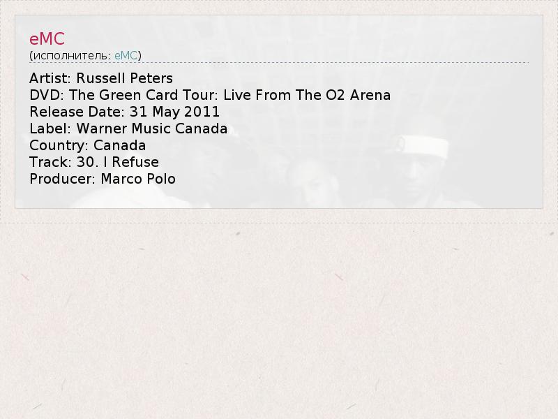 Это интересно:eMC (1998–present) is a hip hop crew composed of rappers Masta Ace , Wordsworth , Punchline and Stricklin .Though not officially formed as a group until 2005, the crew came together in 2001 while touring together on Masta Ace's Disposable Arts tour. Ace described the group's formation in an interview with IllHillEast.com:"It came about back in 2001, I went on tour to promote my album Disposable Arts and on that tour I travel with Strick. Strick was from Milwaukee, where we found Tommy Boy at the time. And I also travel with Punch-N-Words. We ride on the road for about a month or so,... продолжение
