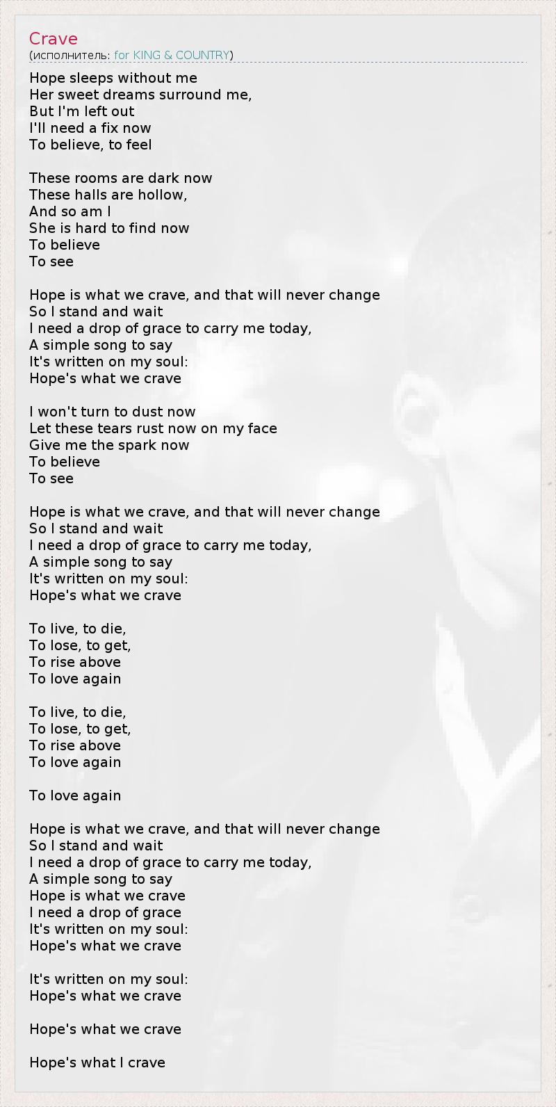 Hope sleeps without me Her sweet dreams surround me, But I'm left out I'll need a fix now To believe, to feel These rooms are dark now These halls are hollow, And so am I She is hard to find now To believe To see Hope is what we crave, and that will never change So I stand and wait I need a drop of grace to carry me today, A simple song to say It's written on my soul: Hope's what we crave I won't turn to dust now Let these tears rust now on my face Give me the spark now To believe To see Hope is what we crave, and that will never change So I stand and wait I need a drop of grace to carry me today, A simple song to say It's written on my soul: Hope's what we crave To live, to die, To lose, to get, To rise above To love again To live, to die, To lose, to get, To rise above To love again To love again Hope is what we crave, and that will never change So I stand and wait I need a drop of grace to carry me today, A simple song to say Hope is what we crave I need a drop of grace It's written on my soul: Hope's what we crave It's written on my soul: Hope's what we crave Hope's what we crave Hope's what I crave
