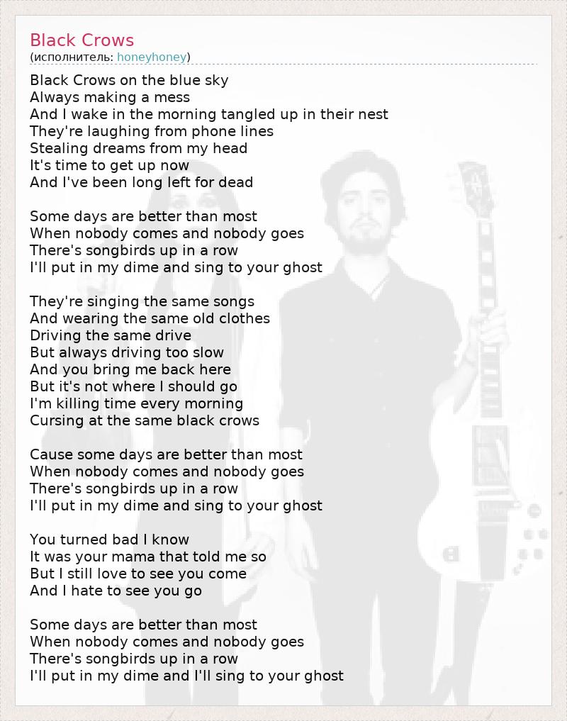 Black Crows on the blue sky Always making a mess And I wake in the morning tangled up in their nest They're laughing from phone lines Stealing dreams from my head It's time to get up now And I've been long left for dead Some days are better than most When nobody comes and nobody goes There's songbirds up in a row I'll put in my dime and sing to your ghost They're singing the same songs And wearing the same old clothes Driving the same drive But always driving too slow And you bring me back here But it's not where I should go I'm killing time every morning Cursing at the same black crows Cause some days are better than most When nobody comes and nobody goes There's songbirds up in a row I'll put in my dime and sing to your ghost You turned bad I know It was your mama that told me so But I still love to see you come And I hate to see you go Some days are better than most When nobody comes and nobody goes There's songbirds up in a row I'll put in my dime and I'll sing to your ghost