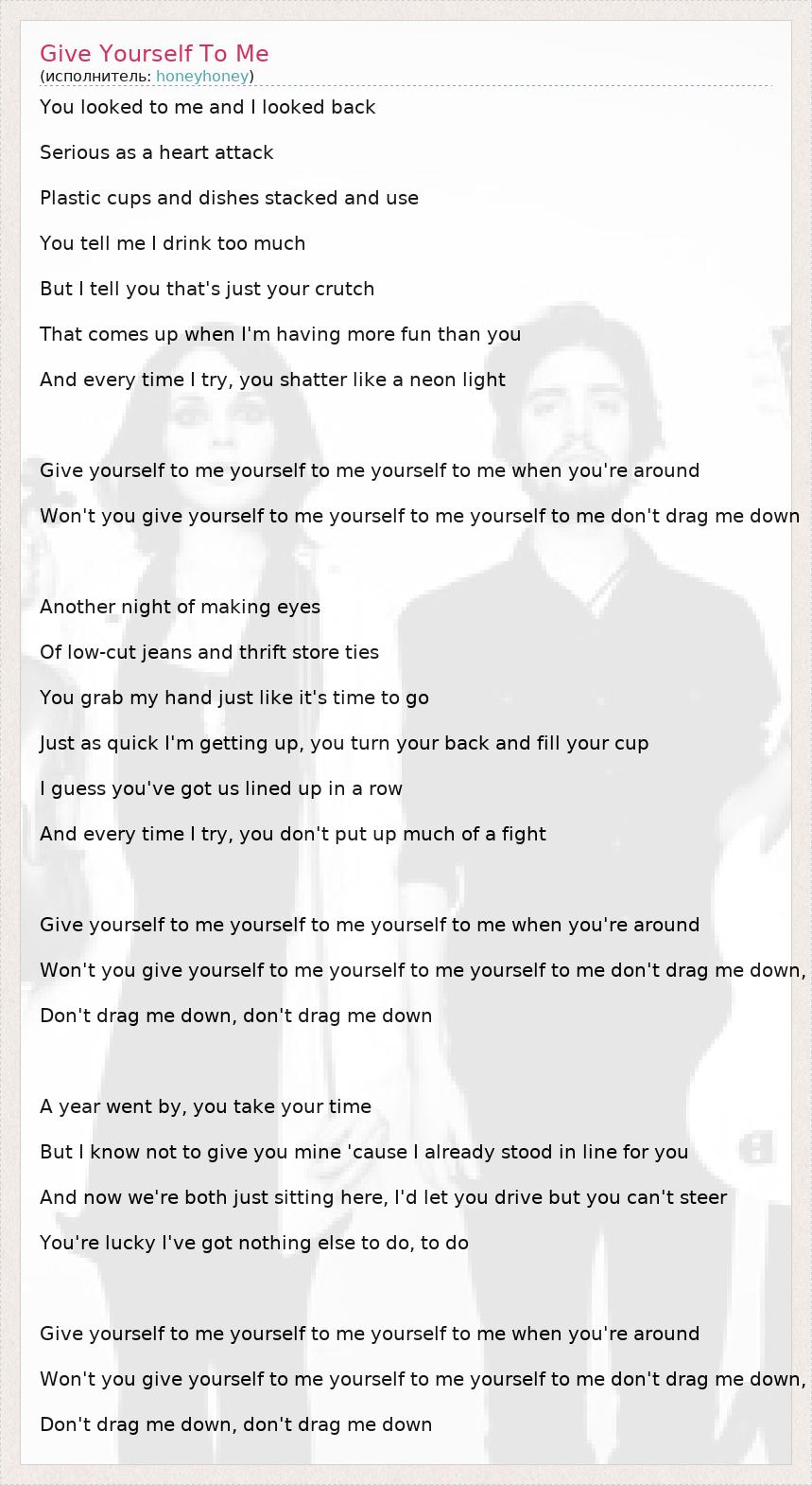You looked to me and I looked back Serious as a heart attack Plastic cups and dishes stacked and use You tell me I drink too much But I tell you that's just your crutch That comes up when I'm having more fun than you And every time I try, you shatter like a neon light Give yourself to me yourself to me yourself to me when you're around Won't you give yourself to me yourself to me yourself to me don't drag me down Another night of making eyes Of low-cut jeans and thrift store ties You grab my hand just like it's time to go Just as quick I'm getting up, you turn your back and fill your cup I guess you've got us lined up in a row And every time I try, you don't put up much of a fight Give yourself to me yourself to me yourself to me when you're around Won't you give yourself to me yourself to me yourself to me don't drag me down, Don't drag me down, don't drag me down A year went by, you take your time But I know not to give you mine 'cause I already stood in line for you And now we're both just sitting here, I'd let you drive but you can't steer You're lucky I've got nothing else to do, to do Give yourself to me yourself to me yourself to me when you're around Won't you give yourself to me yourself to me yourself to me don't drag me down, Don't drag me down, don't drag me down