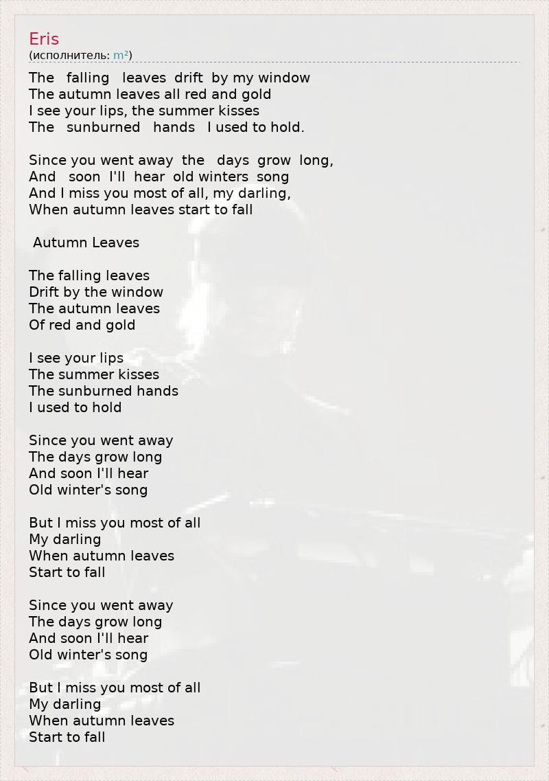 The falling leaves drift by my window The autumn leaves all red and gold I see your lips, the summer kisses The sunburned hands I used to hold. Since you went away the days grow long, And soon I'll hear old winters song And I miss you most of all, my darling, When autumn leaves start to fall Autumn Leaves The falling leaves Drift by the window The autumn leaves Of red and gold I see your lips The summer kisses The sunburned hands I used to hold Since you went away The days grow long And soon I'll hear Old winter's song But I miss you most of all My darling When autumn leaves Start to fall Since you went away The days grow long And soon I'll hear Old winter's song But I miss you most of all My darling When autumn leaves Start to fall