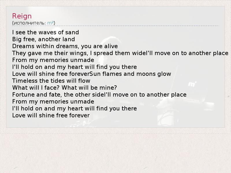 I see the waves of sand Big free, another land Dreams within dreams, you are alive They gave me their wings, I spread them wideI'll move on to another place From my memories unmade I'll hold on and my heart will find you there Love will shine free foreverSun flames and moons glow Timeless the tides will flow What will I face? What will be mine? Fortune and fate, the other sideI'll move on to another place From my memories unmade I'll hold on and my heart will find you there Love will shine free forever
