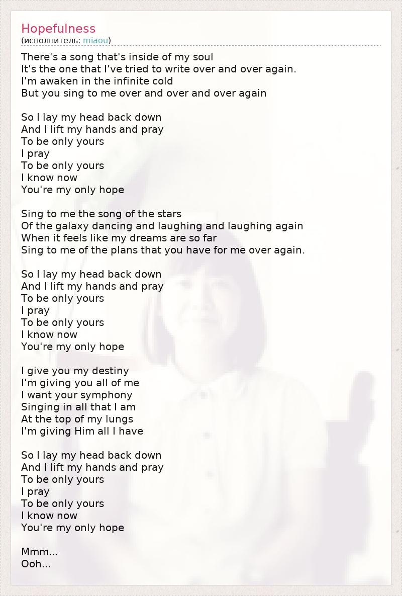 В самой глубине моей души живёт песня, Та, что я пыталась написать снова и снова. Я проснулась в страшном холоде, Но ты поёшь мне снова и снова… И я наклоняю назад голову, Воздеваю к небу руки и молюсь, Чтобы быть только твоей Молюсь Чтобы быть только твоей, Теперь я знаю, Что ты моя единственная надежда. Спой мне песню о звёздах И о галактике, вновь танцующей и смеющейся, Когда кажется, что мои мечты так далеки, Спой мне о планах, которые ты уготовил для меня. И я наклоняю назад голову, Воздеваю к небу руки и молюсь, Чтобы быть только твоей Молюсь Чтобы быть только твоей, Теперь я знаю, Что ты моя единственная надежда. Я доверяю тебе мою судьбу Отдаю тебе всю себя Я хочу, чтобы твоя симфония Пела в каждой моей клетке, Во весь мой голос Я отдаю Ему всё, что имею И я наклоняю назад голову, Воздеваю к небу руки и молюсь, Чтобы быть только твоей Молюсь Чтобы быть только твоей, Теперь я знаю, Что ты моя единственная надежда. Ммм... Ооо...
