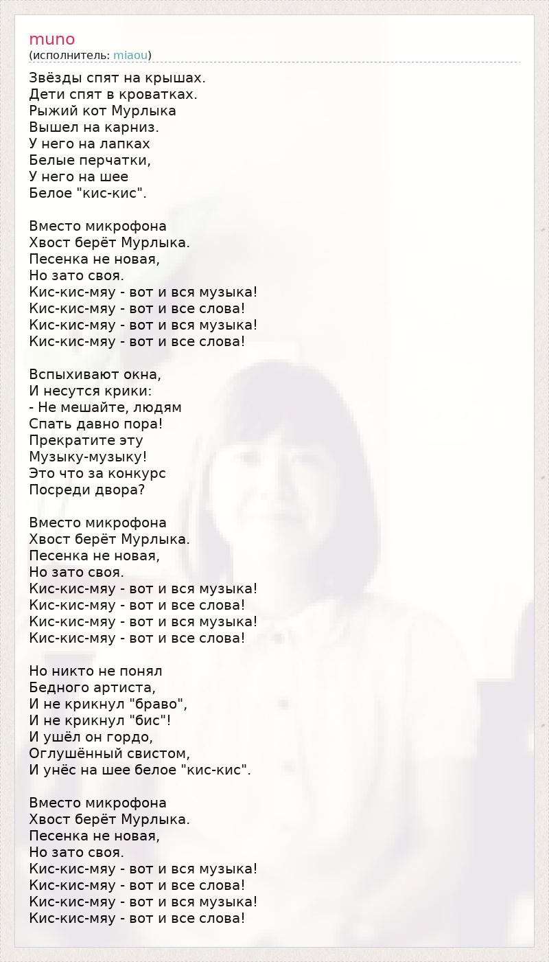 Звёзды спят на крышах. Дети спят в кроватках. Рыжий кот Мурлыка Вышел на карниз. У него на лапках Белые перчатки, У него на шее Белое "кис-кис". Вместо микрофона Хвост берёт Мурлыка. Песенка не новая, Но зато своя. Кис-кис-мяу - вот и вся музыка! Кис-кис-мяу - вот и все слова! Кис-кис-мяу - вот и вся музыка! Кис-кис-мяу - вот и все слова! Вспыхивают окна, И несутся крики: - Не мешайте, людям Спать давно пора! Прекратите эту Музыку-музыку! Это что за конкурс Посреди двора? Вместо микрофона Хвост берёт Мурлыка. Песенка не новая, Но зато своя. Кис-кис-мяу - вот и вся музыка! Кис-кис-мяу - вот и все слова! Кис-кис-мяу - вот и вся музыка! Кис-кис-мяу - вот и все слова! Но никто не понял Бедного артиста, И не крикнул "браво", И не крикнул "бис"! И ушёл он гордо, Оглушённый свистом, И унёс на шее белое "кис-кис". Вместо микрофона Хвост берёт Мурлыка. Песенка не новая, Но зато своя. Кис-кис-мяу - вот и вся музыка! Кис-кис-мяу - вот и все слова! Кис-кис-мяу - вот и вся музыка! Кис-кис-мяу - вот и все слова!