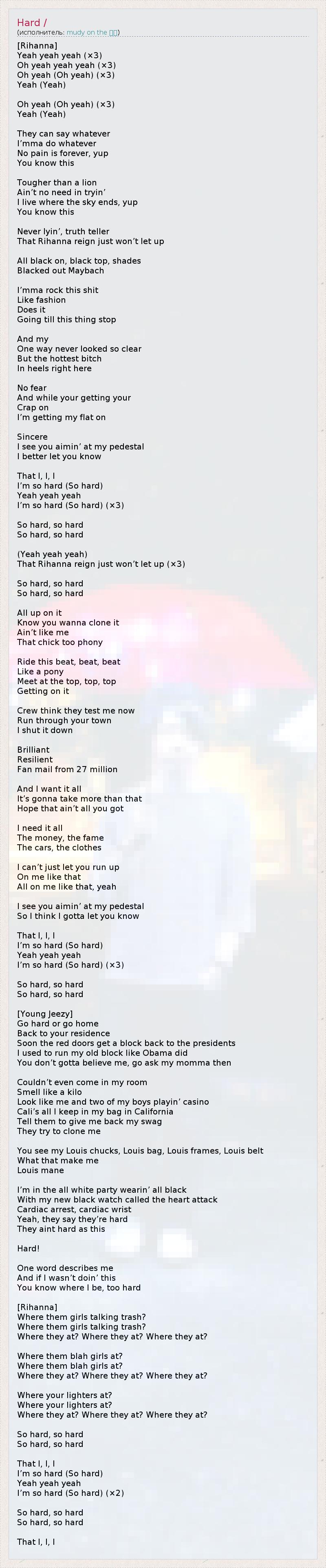 [Rihanna] Yeah yeah yeah (×3) Oh yeah yeah yeah (×3) Oh yeah (Oh yeah) (×3) Yeah (Yeah) Oh yeah (Oh yeah) (×3) Yeah (Yeah) They can say whatever I’mma do whatever No pain is forever, yup You know this Tougher than a lion Ain’t no need in tryin’ I live where the sky ends, yup You know this Never lyin’, truth teller That Rihanna reign just won’t let up All black on, black top, shades Blacked out Maybach I’mma rock this shit Like fashion Does it Going till this thing stop And my One way never looked so clear But the hottest bitch In heels right here No fear And while your getting your Crap on I’m getting my flat on Sincere I see you aimin’ at my pedestal I better let you know That I, I, I I’m so hard (So hard) Yeah yeah yeah I’m so hard (So hard) (×3) So hard, so hard So hard, so hard (Yeah yeah yeah) That Rihanna reign just won’t let up (×3) So hard, so hard So hard, so hard All up on it Know you wanna clone it Ain’t like me That chick too phony Ride this beat, beat, beat Like a pony Meet at the top, top, top Getting on it Crew think they test me now Run through your town I shut it down Brilliant Resilient Fan mail from 27 million And I want it all It’s gonna take more than that Hope that ain’t all you got I need it all The money, the fame The cars, the clothes I can’t just let you run up On me like that All on me like that, yeah I see you aimin’ at my pedestal So I think I gotta let you know That I, I, I I’m so hard (So hard) Yeah yeah yeah I’m so hard (So hard) (×3) So hard, so hard So hard, so hard [Young Jeezy] Go hard or go home Back to your residence Soon the red doors get a block back to the presidents I used to run my old block like Obama did You don’t gotta believe me, go ask my momma then Couldn’t even come in my room Smell like a kilo Look like me and two of my boys playin’ casino Cali’s all I keep in my bag in California Tell them to give me back my swag They try to clone me You see my Louis chucks, Louis bag, Louis frames, Louis belt What that make me Louis mane I’m in the all white party wearin’ all black With my new black watch called the heart attack Cardiac arrest, cardiac wrist Yeah, they say they’re hard They aint hard as this Hard! One word describes me And if I wasn’t doin’ this You know where I be, too hard [Rihanna] Where them girls talking trash? Where them girls talking trash? Where they at? Where they at? Where they at? Where them blah girls at? Where them blah girls at? Where they at? Where they at? Where they at? Where your lighters at? Where your lighters at? Where they at? Where they at? Where they at? So hard, so hard So hard, so hard That I, I, I I’m so hard (So hard) Yeah yeah yeah I’m so hard (So hard) (×2) So hard, so hard So hard, so hard That I, I, I