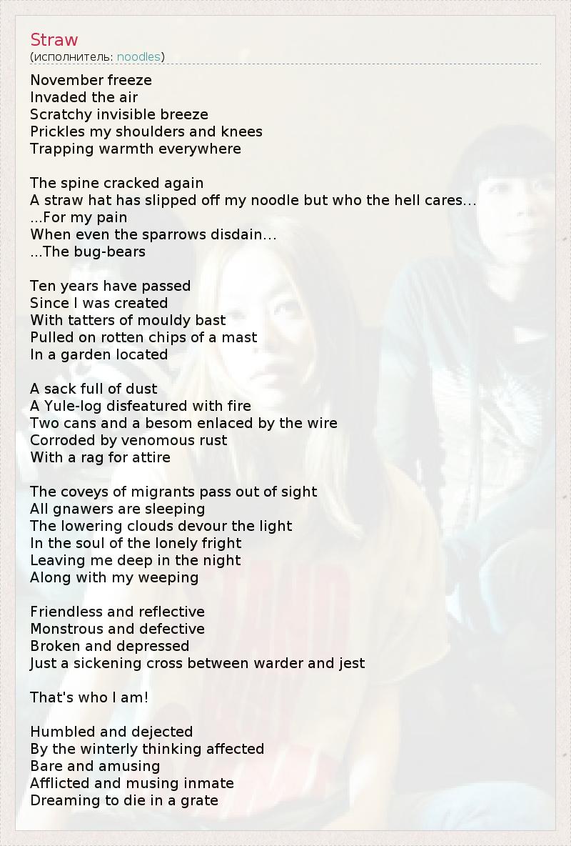 November freeze Invaded the air Scratchy invisible breeze Prickles my shoulders and knees Trapping warmth everywhere The spine cracked again A straw hat has slipped off my noodle but who the hell cares… ...For my pain When even the sparrows disdain… ...The bug-bears Ten years have passed Since I was created With tatters of mouldy bast Pulled on rotten chips of a mast In a garden located A sack full of dust A Yule-log disfeatured with fire Two cans and a besom enlaced by the wire Corroded by venomous rust With a rag for attire The coveys of migrants pass out of sight All gnawers are sleeping The lowering clouds devour the light In the soul of the lonely fright Leaving me deep in the night Along with my weeping Friendless and reflective Monstrous and defective Broken and depressed Just a sickening cross between warder and jest That's who I am! Humbled and dejected By the winterly thinking affected Bare and amusing Afflicted and musing inmate Dreaming to die in a grate