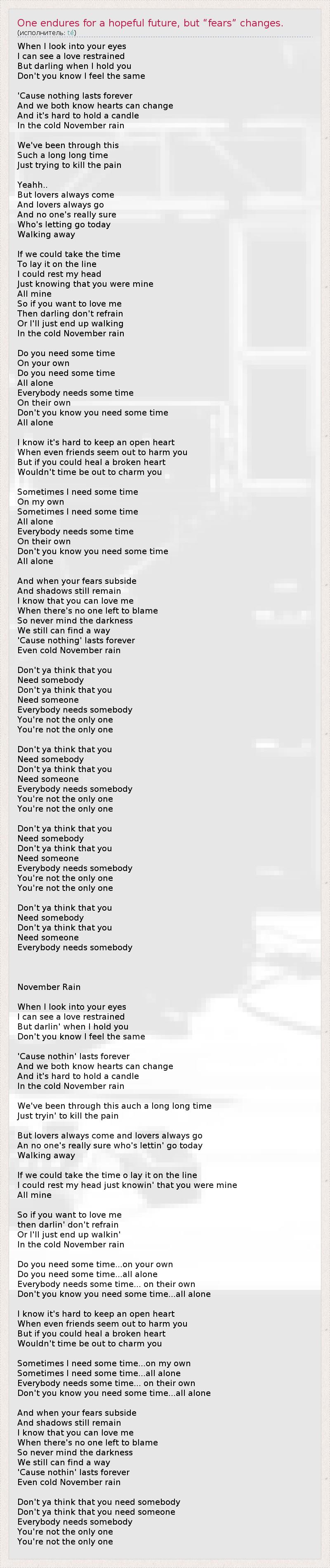 А как ты думаешь, о чем песня "One endures for a hopeful future, but “fears” changes." ?