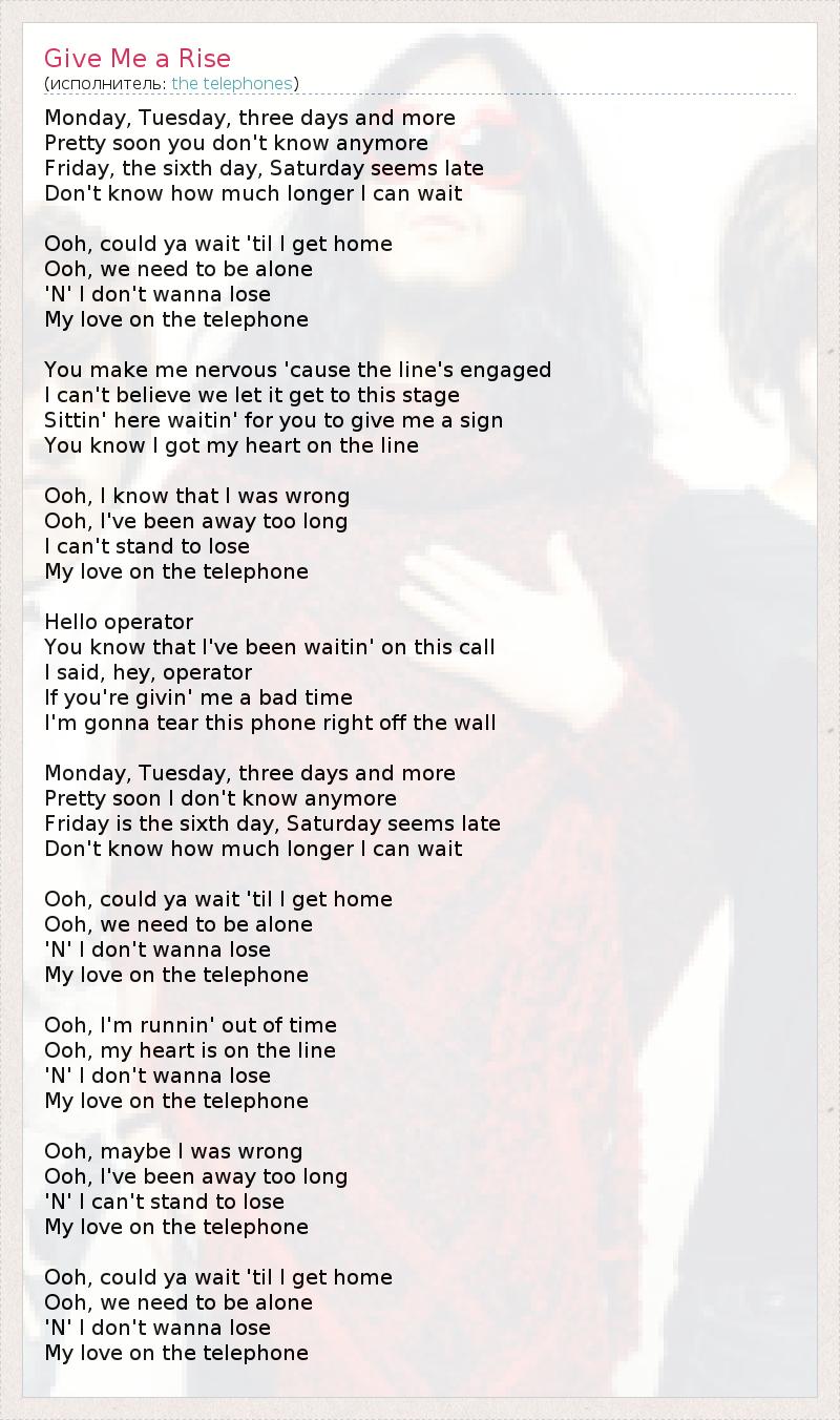 Понедельник, вторник, три дня и более, Довольно скоро ты больше не знаешь... Пятница, шестой день, суббота, кажется, запаздывает, Не знаю, сколько ещё я могу ждать. О, могла бы ты подождать, пока я дойду до дома? О, нам надо побыть наедине, Я не хочу терять Свою телефонную любовь. Ты меня нервируешь, потому что линия занята, Не верится, что мы всё до такой степени запустили. Сижу, жду, когда ты дашь мне знак, Знаешь, моё сердце на линии. О, я знаю, что был неправ, О, меня так долго не было, Не вынесу, если потеряю Свою телефонную любовь. Алло, оператор, Ты знаешь, что я ждал этого звонка, Эй, оператор, Если ты надо мной издеваешься, Я сорву этот телефон со стены. Понедельник, вторник, три дня и более, Довольно скоро я больше не знаю... Пятница - шестой день, суббота, кажется, запаздывает, Не знаю, сколько ещё я могу ждать. О, могла бы ты подождать, пока я дойду до дома? О, нам надо побыть наедине, Я не хочу терять Свою телефонную любовь. О, у меня кончается время. О, моё сердце на линии, Я не хочу терять Свою телефонную любовь. О, может быть, я был неправ, О, меня так долго не было, Не вынесу, если потеряю Свою телефонную любовь. О, могла бы ты подождать, пока я дойду до дома? О, нам надо побыть наедине, Я не хочу терять Свою телефонную любовь.