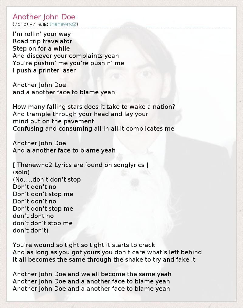 I'm rollin' your way Road trip travelator Step on for a while And discover your complaints yeah You're pushin' me you're pushin' me I push a printer laser Another John Doe and a another face to blame yeah How many falling stars does it take to wake a nation? And trample through your head and lay your mind out on the pavement Confusing and consuming all in all it complicates me Another John Doe And a another face to blame yeah [ Thenewno2 Lyrics are found on songlyrics ] (solo) (No.....don't don't stop Don't don't no Don't don't stop me Don't don't no Don't don't stop me don't dont no don't don't stop me don't don't) You're wound so tight so tight it starts to crack And as long as you got yours you don't care what's left behind It all becomes the same through the shake to try and fake it Another John Doe and we all become the same yeah Another John Doe and a another face to blame yeah Another John Doe and a another face to blame yeah
