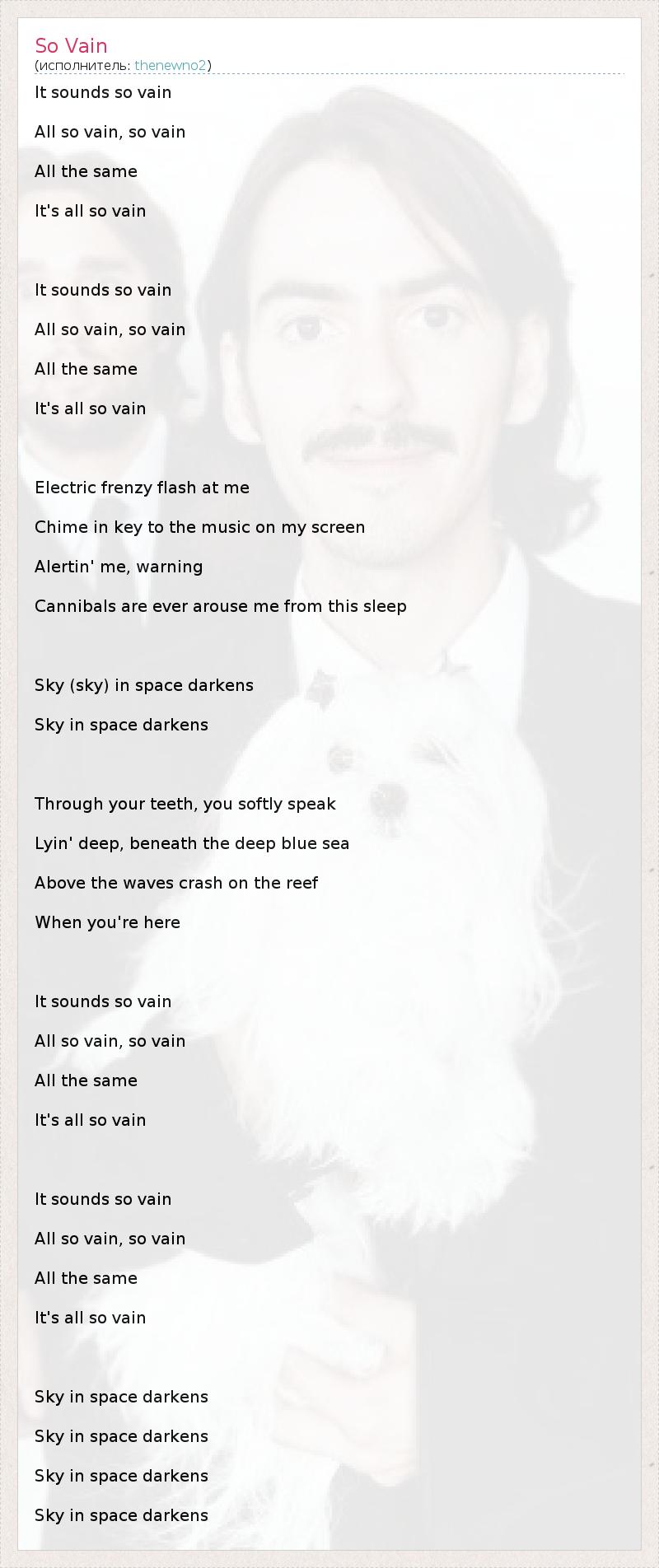 It sounds so vain All so vain, so vain All the same It's all so vain It sounds so vain All so vain, so vain All the same It's all so vain Electric frenzy flash at me Chime in key to the music on my screen Alertin' me, warning Cannibals are ever arouse me from this sleep Sky (sky) in space darkens Sky in space darkens Through your teeth, you softly speak Lyin' deep, beneath the deep blue sea Above the waves crash on the reef When you're here It sounds so vain All so vain, so vain All the same It's all so vain It sounds so vain All so vain, so vain All the same It's all so vain Sky in space darkens Sky in space darkens Sky in space darkens Sky in space darkens