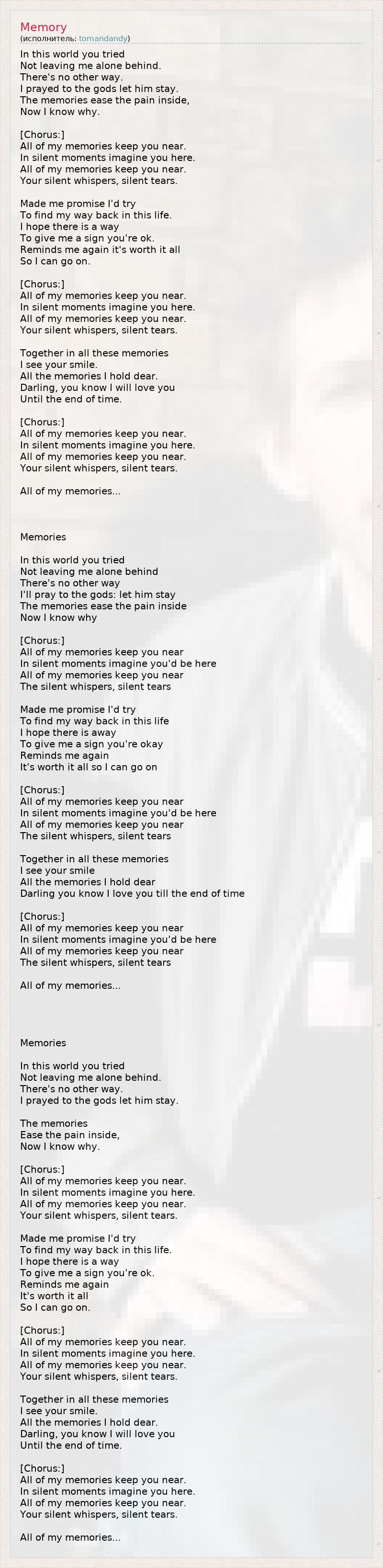 In this world you tried Not leaving me alone behind. There's no other way. I prayed to the gods let him stay. The memories ease the pain inside, Now I know why. [Chorus:] All of my memories keep you near. In silent moments imagine you here. All of my memories keep you near. Your silent whispers, silent tears. Made me promise I'd try To find my way back in this life. I hope there is a way To give me a sign you're ok. Reminds me again it's worth it all So I can go on. [Chorus:] All of my memories keep you near. In silent moments imagine you here. All of my memories keep you near. Your silent whispers, silent tears. Together in all these memories I see your smile. All the memories I hold dear. Darling, you know I will love you Until the end of time. [Chorus:] All of my memories keep you near. In silent moments imagine you here. All of my memories keep you near. Your silent whispers, silent tears. All of my memories... Memories In this world you tried Not leaving me alone behind There's no other way I'll pray to the gods: let him stay The memories ease the pain inside Now I know why [Chorus:] All of my memories keep you near In silent moments imagine you'd be here All of my memories keep you near The silent whispers, silent tears Made me promise I'd try To find my way back in this life I hope there is away To give me a sign you're okay Reminds me again It's worth it all so I can go on [Chorus:] All of my memories keep you near In silent moments imagine you'd be here All of my memories keep you near The silent whispers, silent tears Together in all these memories I see your smile All the memories I hold dear Darling you know I love you till the end of time [Chorus:] All of my memories keep you near In silent moments imagine you'd be here All of my memories keep you near The silent whispers, silent tears All of my memories... Memories In this world you tried Not leaving me alone behind. There's no other way. I prayed to the gods let him stay. The memories Ease the pain inside, Now I know why. [Chorus:] All of my memories keep you near. In silent moments imagine you here. All of my memories keep you near. Your silent whispers, silent tears. Made me promise I'd try To find my way back in this life. I hope there is a way To give me a sign you're ok. Reminds me again It's worth it all So I can go on. [Chorus:] All of my memories keep you near. In silent moments imagine you here. All of my memories keep you near. Your silent whispers, silent tears. Together in all these memories I see your smile. All the memories I hold dear. Darling, you know I will love you Until the end of time. [Chorus:] All of my memories keep you near. In silent moments imagine you here. All of my memories keep you near. Your silent whispers, silent tears. All of my memories...