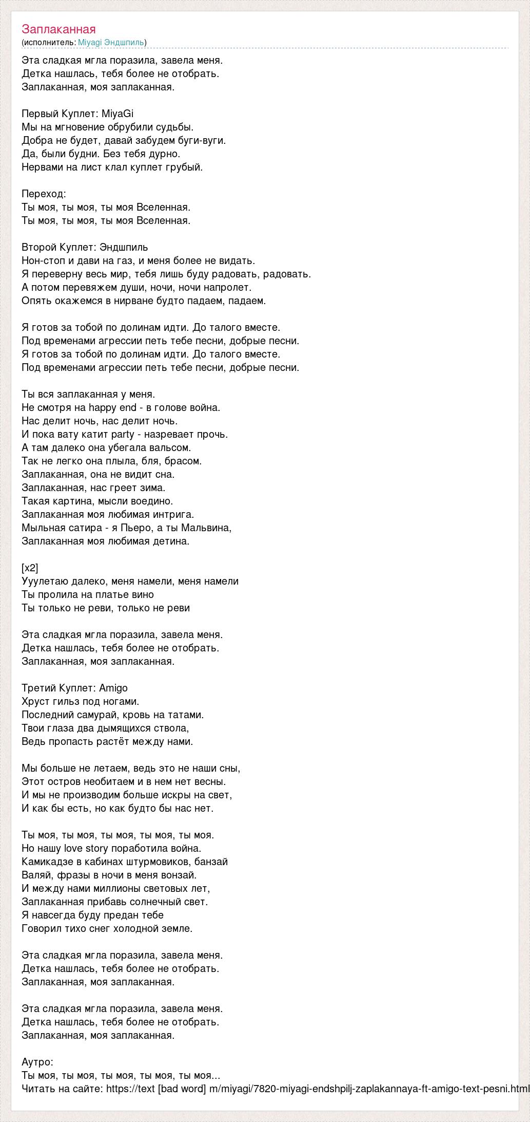 Эта сладкая мгла поразила, завела меня. Детка нашлась, тебя более не отобрать. Заплаканная, моя заплаканная. Первый Куплет: MiyaGi Мы на мгновение обрубили судьбы. Добра не будет, давай забудем буги-вуги. Да, были будни. Без тебя дурно. Нервами на лист клал куплет грубый. Переход: Ты моя, ты моя, ты моя Вселенная. Ты моя, ты моя, ты моя Вселенная. Второй Куплет: Эндшпиль Нон-стоп и дави на газ, и меня более не видать. Я переверну весь мир, тебя лишь буду радовать, радовать. А потом перевяжем души, ночи, ночи напролет. Опять окажемся в нирване будто падаем, падаем. Я готов за тобой по долинам идти. До талого вместе. Под временами агрессии петь тебе песни, добрые песни. Я готов за тобой по долинам идти. До талого вместе. Под временами агрессии петь тебе песни, добрые песни. Ты вся заплаканная у меня. Не смотря на happy end - в голове война. Нас делит ночь, нас делит ночь. И пока вату катит party - назревает прочь. А там далеко она убегала вальсом. Так не легко она плыла, бля, брасом. Заплаканная, она не видит сна. Заплаканная, нас греет зима. Такая картина, мысли воедино. Заплаканная моя любимая интрига. Мыльная сатира - я Пьеро, а ты Мальвина, Заплаканная моя любимая детина. [x2] Ууулетаю далеко, меня намели, меня намели Ты пролила на платье вино Ты только не реви, только не реви Эта сладкая мгла поразила, завела меня. Детка нашлась, тебя более не отобрать. Заплаканная, моя заплаканная. Третий Куплет: Amigo Хруст гильз под ногами. Последний самурай, кровь на татами. Твои глаза два дымящихся ствола, Ведь пропасть растёт между нами. Мы больше не летаем, ведь это не наши сны, Этот остров необитаем и в нем нет весны. И мы не производим больше искры на свет, И как бы есть, но как будто бы нас нет. Ты моя, ты моя, ты моя, ты моя, ты моя. Но нашу love story поработила война. Камикадзе в кабинах штурмовиков, банзай Валяй, фразы в ночи в меня вонзай. И между нами миллионы световых лет, Заплаканная прибавь солнечный свет. Я навсегда буду предан тебе Говорил тихо снег холодной земле. Эта сладкая мгла поразила, завела меня. Детка нашлась, тебя более не отобрать. Заплаканная, моя заплаканная. Эта сладкая мгла поразила, завела меня. Детка нашлась, тебя более не отобрать. Заплаканная, моя заплаканная. Аутро: Ты моя, ты моя, ты моя, ты моя, ты моя... Читать на сайте: https://text [bad word] m/miyagi/7820-miyagi-endshpilj-zaplakannaya-ft-amigo-text-pesni.html