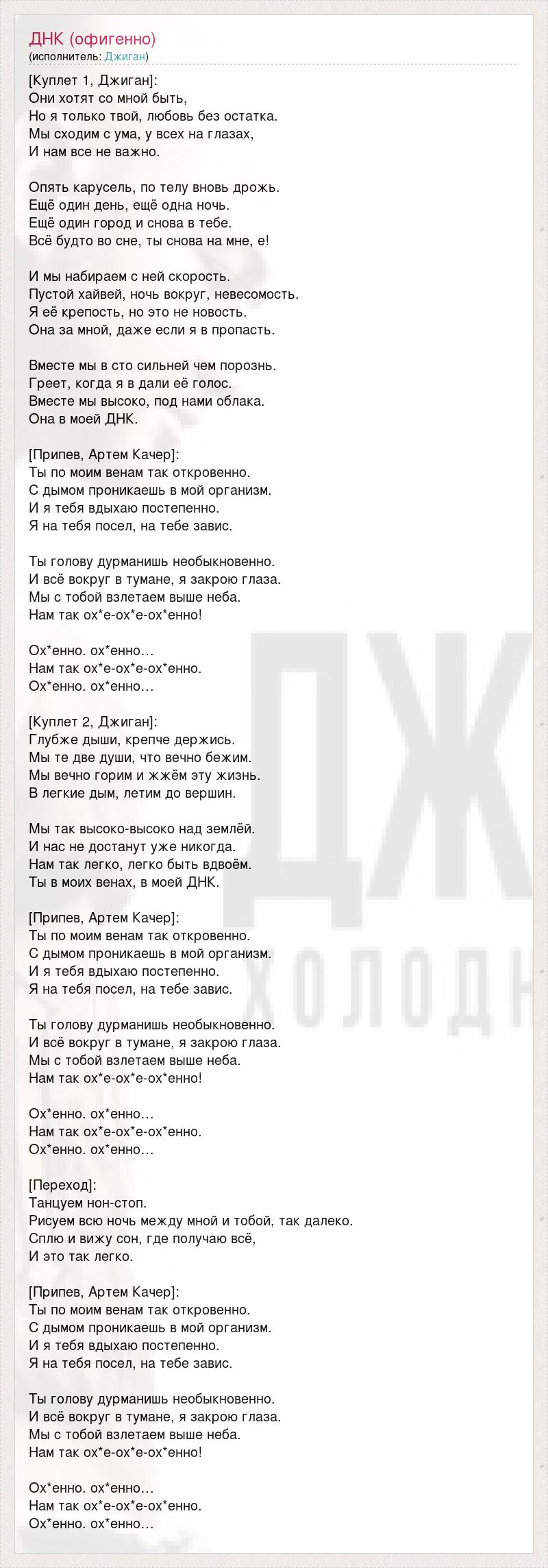 [Куплет 1, Джиган]: Они хотят со мной быть, Но я только твой, любовь без остатка. Мы сходим с ума, у всех на глазах, И нам все не важно. Опять карусель, по телу вновь дрожь. Ещё один день, ещё одна ночь. Ещё один город и снова в тебе. Всё будто во сне, ты снова на мне, е! И мы набираем с ней скорость. Пустой хайвей, ночь вокруг, невесомость. Я её крепость, но это не новость. Она за мной, даже если я в пропасть. Вместе мы в сто сильней чем порознь. Греет, когда я в дали её голос. Вместе мы высоко, под нами облака. Она в моей ДНК. [Припев, Артем Качер]: Ты по моим венам так откровенно. С дымом проникаешь в мой организм. И я тебя вдыхаю постепенно. Я на тебя посел, на тебе завис. Ты голову дурманишь необыкновенно. И всё вокруг в тумане, я закрою глаза. Мы с тобой взлетаем выше неба. Нам так ох*е-ох*е-ох*енно! Ох*енно. ох*енно… Нам так ох*е-ох*е-ох*енно. Ох*енно. ох*енно… [Куплет 2, Джиган]: Глубже дыши, крепче держись. Мы те две души, что вечно бежим. Мы вечно горим и жжём эту жизнь. В легкие дым, летим до вершин. Мы так высоко-высоко над землёй. И нас не достанут уже никогда. Нам так легко, легко быть вдвоём. Ты в моих венах, в моей ДНК. [Припев, Артем Качер]: Ты по моим венам так откровенно. С дымом проникаешь в мой организм. И я тебя вдыхаю постепенно. Я на тебя посел, на тебе завис. Ты голову дурманишь необыкновенно. И всё вокруг в тумане, я закрою глаза. Мы с тобой взлетаем выше неба. Нам так ох*е-ох*е-ох*енно! Ох*енно. ох*енно… Нам так ох*е-ох*е-ох*енно. Ох*енно. ох*енно… [Переход]: Танцуем нон-стоп. Рисуем всю ночь между мной и тобой, так далеко. Сплю и вижу сон, где получаю всё, И это так легко. [Припев, Артем Качер]: Ты по моим венам так откровенно. С дымом проникаешь в мой организм. И я тебя вдыхаю постепенно. Я на тебя посел, на тебе завис. Ты голову дурманишь необыкновенно. И всё вокруг в тумане, я закрою глаза. Мы с тобой взлетаем выше неба. Нам так ох*е-ох*е-ох*енно! Ох*енно. ох*енно… Нам так ох*е-ох*е-ох*енно. Ох*енно. ох*енно…