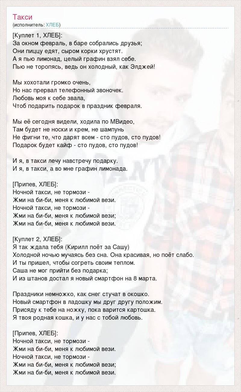 [Куплет 1, ХЛЕБ]: За окном февраль, в баре собрались друзья; Они пиццу едят, сыром корки хрустят. А я пью лимонад, целый графин взял себе. Пью не торопясь, ведь он холодный, как Элджей! Мы хохотали громко очень, Но нас прервал телефонный звоночек. Любовь моя к себе звала, Чтоб подарить подарок в праздник февраля. Мы её сегодня видели, ходила по МВидео, Там будет не носки и крем, не шампунь Не фигни те, что дарят всем - сто пудов, сто пудов! Подарок будет кайф - сто пудов, сто пудов! И я, в такси лечу навстречу подарку. И я, в такси, а во мне графин лимонада. [Припев, ХЛЕБ]: Ночной такси, не тормози - Жми на би-би, меня к любимой вези. Ночной такси, не тормози - Жми на би-би, меня к любимой вези; Жми на би-би, меня к любимой вези. [Куплет 2, ХЛЕБ]: Я так ждала тебя (Кирилл поёт за Сашу) Холодной ночью мучаясь без сна. Она красивая, но поёт слабо. И ты пришел, чтобы согреть своим теплом. Саша не мог прийти без подарка; И из штанов достал я новый смартфон на 8 марта. Праздники немножко, как снег стучат в окошко. Новый смартфон в ладошку мы друг другу положим. Присяду к тебе на ножку, пока варится картошка. Я твоя родная кошка, и у нас с тобой любовь. [Припев, ХЛЕБ]: Ночной такси, не тормози - Жми на би-би, меня к любимой вези. Ночной такси, не тормози - Жми на би-би, меня к любимой вези; Жми на би-би, меня к любимой вези.