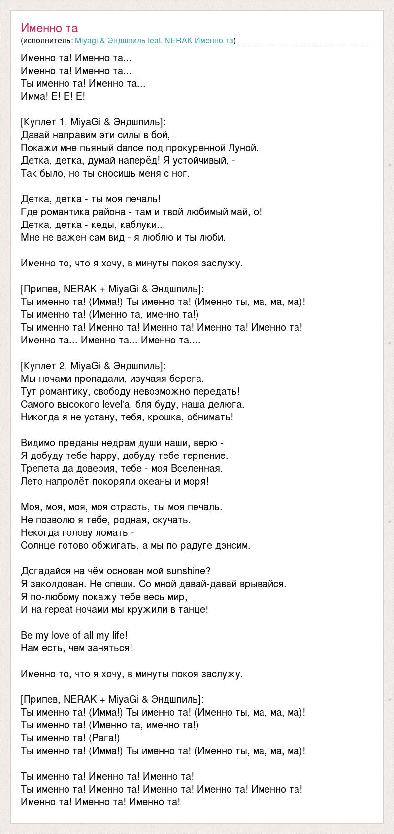 Именно та! Именно та... Именно та! Именно та... Ты именно та! Именно та... Имма! Е! Е! Е! [Куплет 1, MiyaGi & Эндшпиль]: Давай направим эти силы в бой, Покажи мне пьяный dаnce под прокуренной Луной. Детка, детка, думай наперёд! Я устойчивый, - Так было, но ты сносишь меня с ног. Детка, детка - ты моя печаль! Где романтика района - там и твой любимый май, о! Детка, детка - кеды, каблуки... Мне не важен сам вид - я люблю и ты люби. Именно то, что я хочу, в минуты покоя заслужу. [Припев, NERAK + MiyaGi & Эндшпиль]: Ты именно та! (Имма!) Ты именно та! (Именно ты, ма, ма, ма)! Ты именно та! (Именно та, именно та!) Ты именно та! Именно та! Именно та! Именно та! Именно та! Именно та... Именно та... Именно та.... [Куплет 2, MiyaGi & Эндшпиль]: Мы ночами пропадали, изучаяя берега. Тут романтику, свободу невозможно передать! Самого высокого level'а, бля буду, наша делюга. Никогда я не устану, тебя, крошка, обнимать! Видимо преданы недрам души наши, верю - Я добуду тебе happy, добуду тебе терпение. Трепета да доверия, тебе - моя Вселенная. Лето напролёт покоряли океаны и моря! Моя, моя, моя, моя страсть, ты моя печаль. Не позволю я тебе, родная, скучать. Некогда голову ломать - Солнце готово обжигать, а мы по радуге дэнсим. Догадайся на чём основан мой sunshine? Я заколдован. Не спеши. Со мной давай-давай врывайся. Я по-любому покажу тебе весь мир, И на repeat ночами мы кружили в танце! Be my love of all my life! Нам есть, чем заняться! Именно то, что я хочу, в минуты покоя заслужу. [Припев, NERAK + MiyaGi & Эндшпиль]: Ты именно та! (Имма!) Ты именно та! (Именно ты, ма, ма, ма)! Ты именно та! (Именно та, именно та!) Ты именно та! (Рага!) Ты именно та! (Имма!) Ты именно та! (Именно ты, ма, ма, ма)! Ты именно та! Именно та! Именно та! Ты именно та! Именно та! Именно та! Именно та! Именно та! Именно та! Именно та! Именно та!