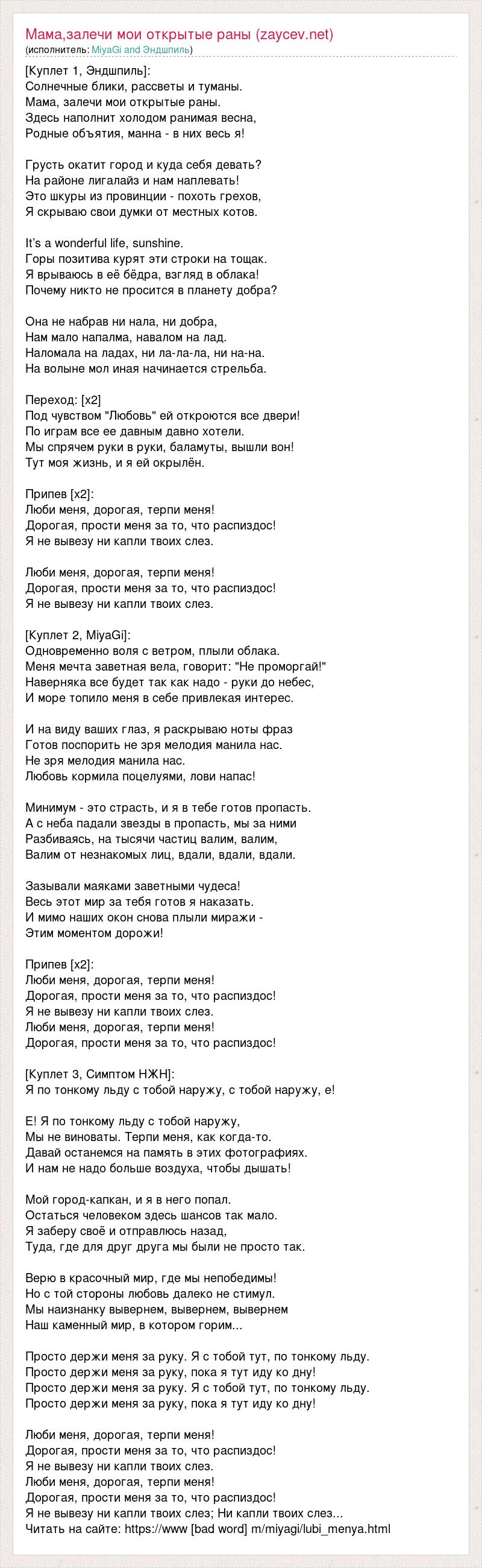 [Куплет 1, Эндшпиль]: Солнечные блики, рассветы и туманы. Мама, залечи мои открытые раны. Здесь наполнит холодом ранимая весна, Родные объятия, манна - в них весь я! Грусть окатит город и куда себя девать? На районе лигалайз и нам наплевать! Это шкуры из провинции - похоть грехов, Я скрываю свои думки от местных котов. It’s a wonderful life, sunshine. Горы позитива курят эти строки на тощак. Я врываюсь в её бёдра, взгляд в облака! Почему никто не просится в планету добра? Она не набрав ни нала, ни добра, Нам мало напалма, навалом на лад. Наломала на ладах, ни ла-ла-ла, ни на-на. На волыне мол иная начинается стрельба. Переход: [х2] Под чувством "Любовь" ей откроются все двери! По играм все ее давным давно хотели. Мы спрячем руки в руки, баламуты, вышли вон! Тут моя жизнь, и я ей окрылён. Припев [х2]: Люби меня, дорогая, терпи меня! Дорогая, прости меня за то, что распиздос! Я не вывезу ни капли твоих слез. Люби меня, дорогая, терпи меня! Дорогая, прости меня за то, что распиздос! Я не вывезу ни капли твоих слез. [Куплет 2, MiyaGi]: Одновременно воля с ветром, плыли облака. Меня мечта заветная вела, говорит: "Не проморгай!" Наверняка все будет так как надо - руки до небес, И море топило меня в себе привлекая интерес. И на виду ваших глаз, я раскрываю ноты фраз Готов поспорить не зря мелодия манила нас. Не зря мелодия манила нас. Любовь кормила поцелуями, лови напас! Минимум - это страсть, и я в тебе готов пропасть. А с неба падали звезды в пропасть, мы за ними Разбиваясь, на тысячи частиц валим, валим, Валим от незнакомых лиц, вдали, вдали, вдали. Зазывали маяками заветными чудеса! Весь этот мир за тебя готов я наказать. И мимо наших окон снова плыли миражи - Этим моментом дорожи! Припев [х2]: Люби меня, дорогая, терпи меня! Дорогая, прости меня за то, что распиздос! Я не вывезу ни капли твоих слез. Люби меня, дорогая, терпи меня! Дорогая, прости меня за то, что распиздос! [Куплет 3, Симптом НЖН]: Я по тонкому льду с тобой наружу, с тобой наружу, е! Е! Я по тонкому льду с тобой наружу, Мы не виноваты. Терпи меня, как когда-то. Давай останемся на память в этих фотографиях. И нам не надо больше воздуха, чтобы дышать! Мой город-капкан, и я в него попал. Остаться человеком здесь шансов так мало. Я заберу своё и отправлюсь назад, Туда, где для друг друга мы были не просто так. Верю в красочный мир, где мы непобедимы! Но с той стороны любовь далеко не стимул. Мы наизнанку вывернем, вывернем, вывернем Наш каменный мир, в котором горим... Просто держи меня за руку. Я с тобой тут, по тонкому льду. Просто держи меня за руку, пока я тут иду ко дну! Просто держи меня за руку. Я с тобой тут, по тонкому льду. Просто держи меня за руку, пока я тут иду ко дну! Люби меня, дорогая, терпи меня! Дорогая, прости меня за то, что распиздос! Я не вывезу ни капли твоих слез. Люби меня, дорогая, терпи меня! Дорогая, прости меня за то, что распиздос! Я не вывезу ни капли твоих слез; Ни капли твоих слез... Читать на сайте: https://www [bad word] m/miyagi/lubi_menya.html