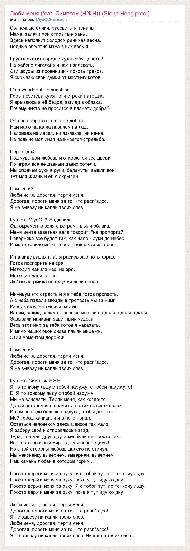 Солнечные блики, рассветы и туманы. Мама, залечи мои открытые раны. Здесь наполнит холодом ранимая весна. Водные объятия мама в них весь я. Грусть окатит город и куда себя девать? На районе лигалайз и нам наплевать. Эти шкуры из провинции - похоть грехов. Я скрываю свои думки от местных котов. It’s a wonderful life sunshine. Горы позитива курят эти строки натощак. Я врываюсь в её бёдра, взгляд в облака. Почему никто не просится в планету добра? Она не набрав не нала не добра. Нам мало напалма навалом на лад. Наломала на ладах, ни ла-ла-ла, ни на-на. На полыне мол иная начинается стрельба. Переход:х2 Под чувством любовь и откроются все двери. По играм все ее давным давно хотели. Мы спрячем руки в руки, баламуты, вышли вон! Тут моя жизнь и ей я окрылён. Припев:х2 Люби меня, дорогая, терпи меня. Дорогая, прости меня за то, что расп*здос. Я не вывезу ни капли твоих слез. Куплет: MiyaGi & Эндшпиль Одновременно воля с ветром, плыли облака. Меня мечта заветная вела говорит: "не проморгай!". Наверняка все будет так, как надо - руки до небес. И море топило меня в себе привлекая интерес. И на виду ваших глаз я раскрываю ноты фраз. Готов поспорить не зря. Мелодия манила нас, не зря. Мелодия манила нас. Любовь кормила поцелуями лови напас. Минимум это страсть и я в тебе готов пропасть. А с неба падали звезды в пропасть мы за ними. Разбиваясь, на тысячи частиц. Валим, валим, валим от незнакомых лиц, вдали, вдали, вдали. Зазывали маяками заветными чудеса. Весь этот мир за тебя готов я наказать. И мимо наших окон снова плыли миражи. Этим моментом дорожи! Припев:х2 Люби меня, дорогая, терпи меня. Дорогая, прости меня за то, что расп*здос. Я не вывезу ни капли твоих слез. Куплет: Симптом НЖН Я по тонкому льду с тобой наружу, с тобой наружу, е! Е! Я по тонкому льду с тобой наружу. Мы не виноваты. Терпи меня, как когда-то. Давай останемся на память, в этих потоках вверх. И нам не надо больше воздуха, чтобы дышать! Мой город-капкан, и я в него попал. Остаться человеком здесь шансов так мало. Я заберу своё и отправлюсь назад, Туда, где для друг друга мы были не просто так. Верю в красочный мир, где мы непобедимы! Но с той стороны любовь далеко не стимул. Мы наизнанку вывернем, вывернем, вывернем Наш камень любви в котором горим... Просто держи меня за руку. Я с тобой тут, по тонкому льду. Просто держи меня за руку, пока я тут иду ко дну! Просто держи меня за руку. Я с тобой тут, по тонкому льду. Просто держи меня за руку, пока я тут иду ко дну! Люби меня, дорогая, терпи меня! Дорогая, прости меня за то, что расп*здос! Я не вывезу ни капли твоих слез. Люби меня, дорогая, терпи меня! Дорогая, прости меня за то, что расп*здос! Я не вывезу ни капли твоих слез; Ни капли твоих слез...
