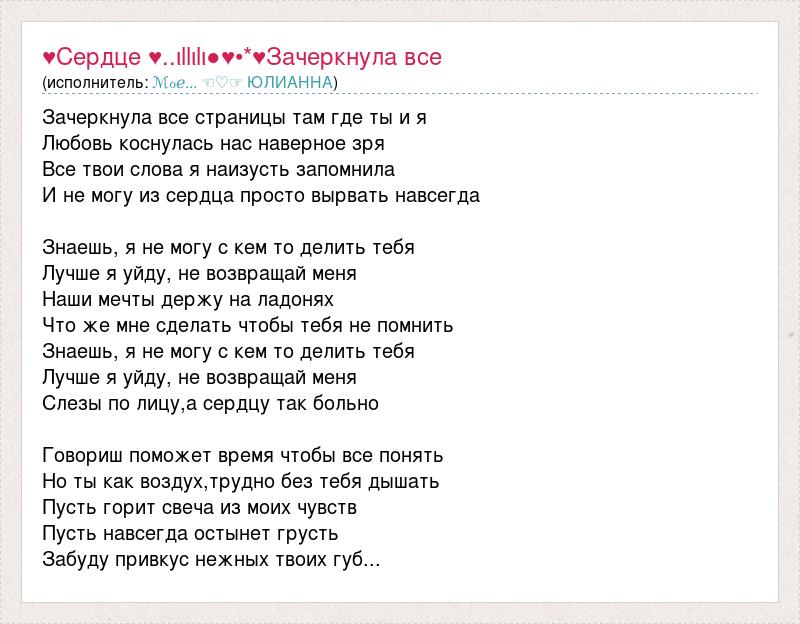 Зачеркнула все страницы там где ты и я Любовь коснулась нас наверное зря Все твои слова я наизусть запомнила И не могу из сердца просто вырвать навсегда Знаешь, я не могу с кем то делить тебя Лучше я уйду, не возвращай меня Наши мечты держу на ладонях Что же мне сделать чтобы тебя не помнить Знаешь, я не могу с кем то делить тебя Лучше я уйду, не возвращай меня Слезы по лицу,а сердцу так больно Говориш поможет время чтобы все понять Но ты как воздух,трудно без тебя дышать Пусть горит свеча из моих чувств Пусть навсегда остынет грусть Забуду привкус нежных твоих губ...