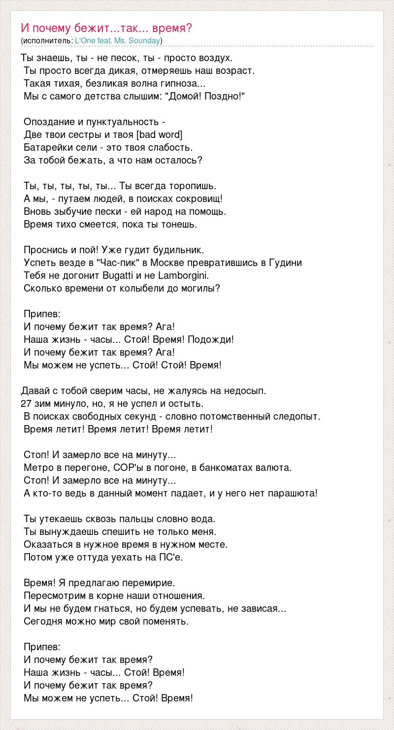 Ты знаешь, ты - не песок, ты - просто воздух. Ты просто всегда дикая, отмеряешь наш возраст. Такая тихая, безликая волна гипноза... Мы с самого детства слышим: "Домой! Поздно!" Опоздание и пунктуальность - Две твои сестры и твоя [bad word] Батарейки сели - это твоя слабость. За тобой бежать, а что нам осталось? Ты, ты, ты, ты, ты... Ты всегда торопишь. А мы, - путаем людей, в поисках сокровищ! Вновь зыбучие пески - ей народ на помощь. Время тихо смеется, пока ты тонешь. Проснись и пой! Уже гудит будильник. Успеть везде в "Час-пик" в Москве превратившись в Гудини Тебя не догонит Bugatti и не Lamborgini. Сколько времени от колыбели до могилы? Припев: И почему бежит так время? Ага! Наша жизнь - часы... Стой! Время! Подожди! И почему бежит так время? Ага! Мы можем не успеть... Стой! Стой! Время! Давай с тобой сверим часы, не жалуясь на недосып. 27 зим минуло, но, я не успел и остыть. В поисках свободных секунд - словно потомственный следопыт. Время летит! Время летит! Время летит! Стоп! И замерло все на минуту... Метро в перегоне, COP'ы в погоне, в банкоматах валюта. Стоп! И замерло все на минуту... А кто-то ведь в данный момент падает, и у него нет парашюта! Ты утекаешь сквозь пальцы словно вода. Ты вынуждаешь спешить не только меня. Оказаться в нужное время в нужном месте. Потом уже оттуда уехать на ПС'е. Время! Я предлагаю перемирие. Пересмотрим в корне наши отношения. И мы не будем гнаться, но будем успевать, не зависая... Сегодня можно мир свой поменять. Припев: И почему бежит так время? Наша жизнь - часы... Стой! Время! И почему бежит так время? Мы можем не успеть... Стой! Время!