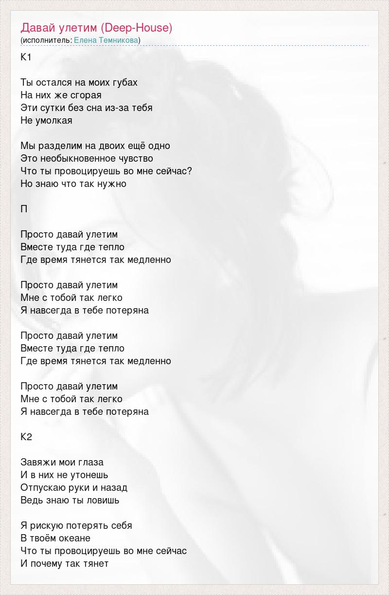 К1 Ты остался на моих губах На них же сгорая Эти сутки без сна из-за тебя Не умолкая Мы разделим на двоих ещё одно Это необыкновенное чувство Что ты провоцируешь во мне сейчас? Но знаю что так нужно П Просто давай улетим Вместе туда где тепло Где время тянется так медленно Просто давай улетим Мне с тобой так легко Я навсегда в тебе потеряна Просто давай улетим Вместе туда где тепло Где время тянется так медленно Просто давай улетим Мне с тобой так легко Я навсегда в тебе потеряна К2 Завяжи мои глаза И в них не утонешь Отпускаю руки и назад Ведь знаю ты ловишь Я рискую потерять себя В твоём океане Что ты провоцируешь во мне сейчас И почему так тянет