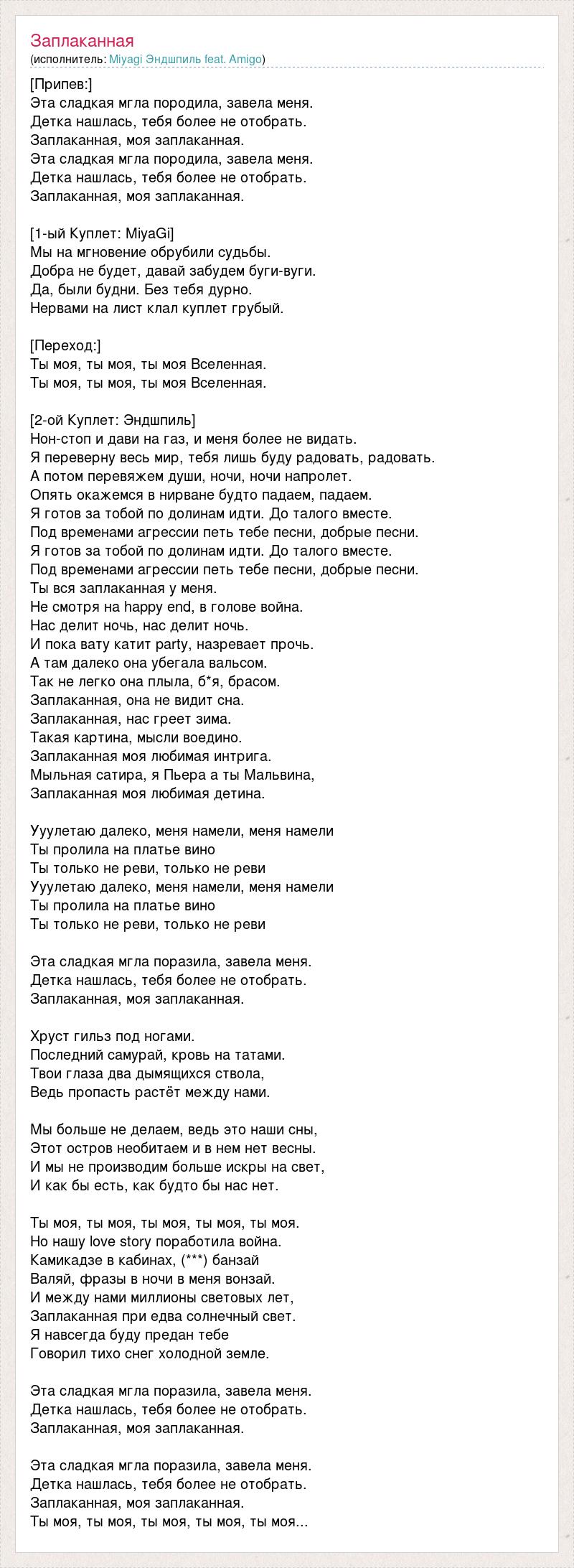 [Припев:] Эта сладкая мгла породила, завела меня. Детка нашлась, тебя более не отобрать. Заплаканная, моя заплаканная. Эта сладкая мгла породила, завела меня. Детка нашлась, тебя более не отобрать. Заплаканная, моя заплаканная. [1-ый Куплет: MiyaGi] Мы на мгновение обрубили судьбы. Добра не будет, давай забудем буги-вуги. Да, были будни. Без тебя дурно. Нервами на лист клал куплет грубый. [Переход:] Ты моя, ты моя, ты моя Вселенная. Ты моя, ты моя, ты моя Вселенная. [2-ой Куплет: Эндшпиль] Нон-стоп и дави на газ, и меня более не видать. Я переверну весь мир, тебя лишь буду радовать, радовать. А потом перевяжем души, ночи, ночи напролет. Опять окажемся в нирване будто падаем, падаем. Я готов за тобой по долинам идти. До талого вместе. Под временами агрессии петь тебе песни, добрые песни. Я готов за тобой по долинам идти. До талого вместе. Под временами агрессии петь тебе песни, добрые песни. Ты вся заплаканная у меня. Не смотря на happy end, в голове война. Нас делит ночь, нас делит ночь. И пока вату катит party, назревает прочь. А там далеко она убегала вальсом. Так не легко она плыла, б*я, брасом. Заплаканная, она не видит сна. Заплаканная, нас греет зима. Такая картина, мысли воедино. Заплаканная моя любимая интрига. Мыльная сатира, я Пьера а ты Мальвина, Заплаканная моя любимая детина. Ууулетаю далеко, меня намели, меня намели Ты пролила на платье вино Ты только не реви, только не реви Ууулетаю далеко, меня намели, меня намели Ты пролила на платье вино Ты только не реви, только не реви Эта сладкая мгла поразила, завела меня. Детка нашлась, тебя более не отобрать. Заплаканная, моя заплаканная. Хруст гильз под ногами. Последний самурай, кровь на татами. Твои глаза два дымящихся ствола, Ведь пропасть растёт между нами. Мы больше не делаем, ведь это наши сны, Этот остров необитаем и в нем нет весны. И мы не производим больше искры на свет, И как бы есть, как будто бы нас нет. Ты моя, ты моя, ты моя, ты моя, ты моя. Но нашу love story поработила война. Камикадзе в кабинах, (***) банзай Валяй, фразы в ночи в меня вонзай. И между нами миллионы световых лет, Заплаканная при едва солнечный свет. Я навсегда буду предан тебе Говорил тихо снег холодной земле. Эта сладкая мгла поразила, завела меня. Детка нашлась, тебя более не отобрать. Заплаканная, моя заплаканная. Эта сладкая мгла поразила, завела меня. Детка нашлась, тебя более не отобрать. Заплаканная, моя заплаканная. Ты моя, ты моя, ты моя, ты моя, ты моя...