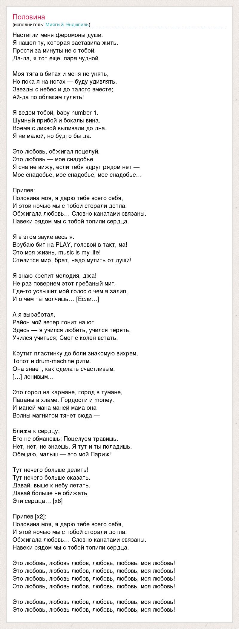 Настигли меня феромоны души. Я нашел ту, которая заставила жить. Прости за минуты не с тобой. Да-да, я тот еще, паря чудной. Моя тяга в битах и меня не унять, Но пока я на ногах — буду удивлять. Звезды с небес и до талого вместе; Ай-да по облакам гулять! Я ведом тобой, baby number 1. Шумный прибой и бокалы вина. Время с лихвой выпивали до дна. Я не малой, но будто бы да. Это любовь, обжигал поцелуй. Это любовь — мое снадобье. Я сна не вижу, если тебя вдруг рядом нет — Мое снадобье, мое снадобье, мое снадобье… Припев: Половина моя, я дарю тебе всего себя, И этой ночью мы с тобой сгорали дотла. Обжигала любовь… Словно канатами связаны. Навеки рядом мы с тобой топили сердца. Я в этом звуке весь я. Врубаю бит на PLAY, головой в такт, ма! Это моя жизнь, music is my life! Стелится мир, брат, надо мутить от души! Я знаю крепит мелодия, джа! Не раз повернем этот гребаный миг. Где-то услышит мой голос о чем я залип, И о чем ты молчишь… [Если…] А я выработал, Район мой ветер гонит на юг. Здесь — я учился любить, учился терять, Учился учиться; Смог с колен встать. Крутит пластинку до боли знакомую вихрем, Топот и drum-machine ритм. Она знает, как сделать счастливым. […] ленивым… Это город на кармане, город в тумане, Пацаны в хламе. Гордости и money. И маней мана маней мама она Волны магнитом тянет сюда — Ближе к сердцу; Его не обманешь; Поцелуем травишь. Нет, нет, не знаешь. Я тут и ты поладишь. Обещаю, малыш — это мой Париж! Тут нечего больше делить! Тут нечего больше сказать. Давай, выше к небу летать. Давай больше не обижать Эти сердца… [x8] Припев [x2]: Половина моя, я дарю тебе всего себя, И этой ночью мы с тобой сгорали дотла. Обжигала любовь… Словно канатами связаны. Навеки рядом мы с тобой топили сердца. Это любовь, любовь любов, любовь, любовь, моя любовь! Это любовь, любовь любов, любовь, любовь, моя любовь! Это любовь, любовь любов, любовь, любовь, моя любовь! Это любовь, любовь любов, любовь, любовь, моя любовь! Это любовь, любовь любов, любовь, любовь, моя любовь! Это любовь, любовь любов, любовь, любовь, моя любовь!
