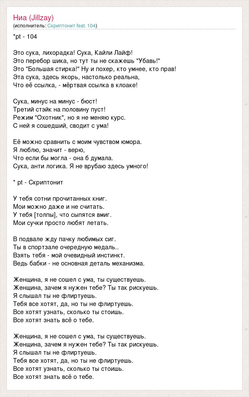 *pt - 104 Это сука, лихорадка! Сука, Кайли Лайф! Это перебор шика, но тут ты не скажешь "Убавь!" Это "Большая стирка!" Ну и похер, кто умнее, кто прав! Эта сука, здесь якорь, настолько реальна, Что её ссылка, - мёртвая ссылка в клоаке! Сука, минус на минус - бюст! Третий стэйк на половину пуст! Режим "Охотник", но я не меняю курс. С ней я сошедший, сводит с ума! Её можно сравнить с моим чувством юмора. Я люблю, значит - верю, Что если бы могла - она б думала. Сука, анти логика. Я не врубаю здесь умного! * pt - Скриптонит У тебя сотни прочитанных книг. Мои можно даже и не считать. У тебя [толпы], что сыпятся вмиг. Мои сучки просто любят летать. В подвале жду пачку любимых сиг. Ты в спортзале очередную медаль.. Взять тебя - мой очевидный инстинкт. Ведь бабки - не основная деталь механизма. Женщина, я не сошел с ума, ты существуешь. Женщина, зачем я нужен тебе? Ты так рискуешь. Я слышал ты не флиртуешь. Тебя все хотят, да, но ты не флиртуешь. Все хотят узнать, сколько ты стоишь. Все хотят знать всё о тебе. Женщина, я не сошел с ума, ты существуешь. Женщина, зачем я нужен тебе? Ты так рискуешь. Я слышал ты не флиртуешь. Тебя все хотят, да, но ты не флиртуешь. Все хотят узнать, сколько ты стоишь. Все хотят знать всё о тебе.