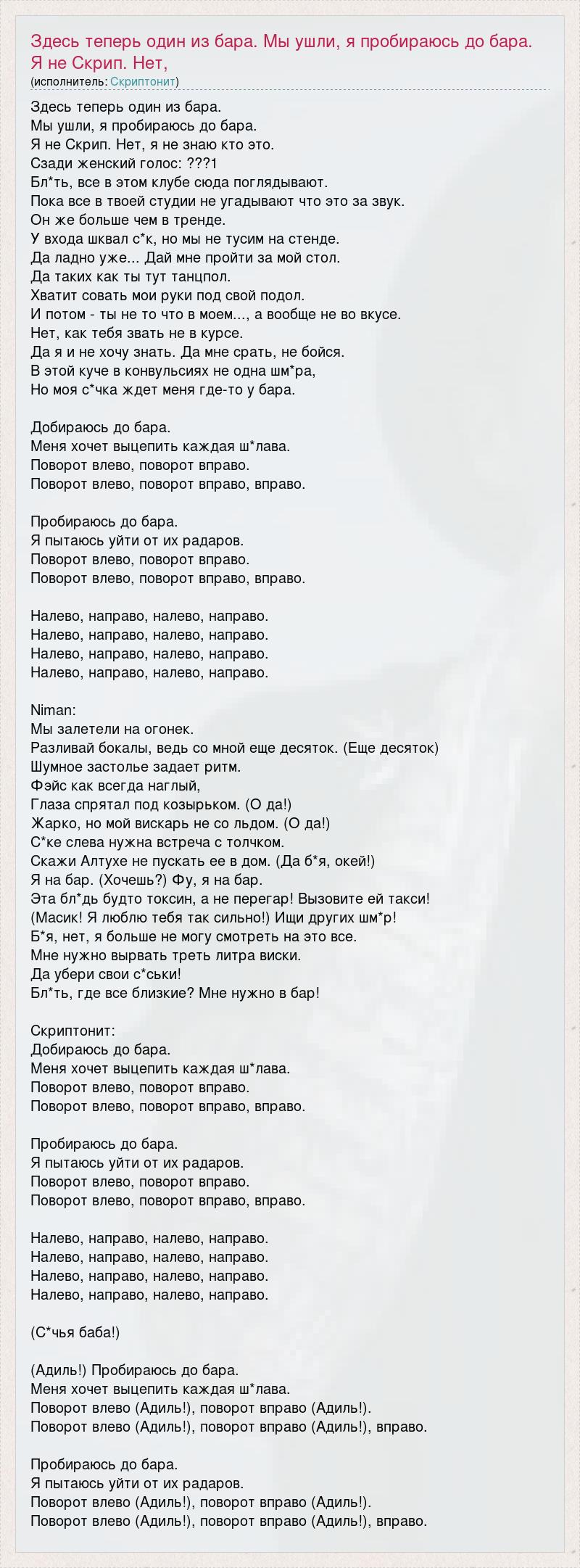 Здесь теперь один из бара. Мы ушли, я пробираюсь до бара. Я не Скрип. Нет, я не знаю кто это. Сзади женский голос: ???1 Бл*ть, все в этом клубе сюда поглядывают. Пока все в твоей студии не угадывают что это за звук. Он же больше чем в тренде. У входа шквал с*к, но мы не тусим на стенде. Да ладно уже... Дай мне пройти за мой стол. Да таких как ты тут танцпол. Хватит совать мои руки под свой подол. И потом - ты не то что в моем..., а вообще не во вкусе. Нет, как тебя звать не в курсе. Да я и не хочу знать. Да мне срать, не бойся. В этой куче в конвульсиях не одна шм*ра, Но моя с*чка ждет меня где-то у бара. Добираюсь до бара. Меня хочет выцепить каждая ш*лава. Поворот влево, поворот вправо. Поворот влево, поворот вправо, вправо. Пробираюсь до бара. Я пытаюсь уйти от их радаров. Поворот влево, поворот вправо. Поворот влево, поворот вправо, вправо. Налево, направо, налево, направо. Налево, направо, налево, направо. Налево, направо, налево, направо. Налево, направо, налево, направо. Niman: Мы залетели на огонек. Разливай бокалы, ведь со мной еще десяток. (Еще десяток) Шумное застолье задает ритм. Фэйс как всегда наглый, Глаза спрятал под козырьком. (О да!) Жарко, но мой вискарь не со льдом. (О да!) С*ке слева нужна встреча с толчком. Скажи Алтухе не пускать ее в дом. (Да б*я, окей!) Я на бар. (Хочешь?) Фу, я на бар. Эта бл*дь будто токсин, а не перегар! Вызовите ей такси! (Масик! Я люблю тебя так сильно!) Ищи других шм*р! Б*я, нет, я больше не могу смотреть на это все. Мне нужно вырвать треть литра виски. Да убери свои с*ськи! Бл*ть, где все близкие? Мне нужно в бар! Скриптонит: Добираюсь до бара. Меня хочет выцепить каждая ш*лава. Поворот влево, поворот вправо. Поворот влево, поворот вправо, вправо. Пробираюсь до бара. Я пытаюсь уйти от их радаров. Поворот влево, поворот вправо. Поворот влево, поворот вправо, вправо. Налево, направо, налево, направо. Налево, направо, налево, направо. Налево, направо, налево, направо. Налево, направо, налево, направо. (С*чья баба!) (Адиль!) Пробираюсь до бара. Меня хочет выцепить каждая ш*лава. Поворот влево (Адиль!), поворот вправо (Адиль!). Поворот влево (Адиль!), поворот вправо (Адиль!), вправо. Пробираюсь до бара. Я пытаюсь уйти от их радаров. Поворот влево (Адиль!), поворот вправо (Адиль!). Поворот влево (Адиль!), поворот вправо (Адиль!), вправо.