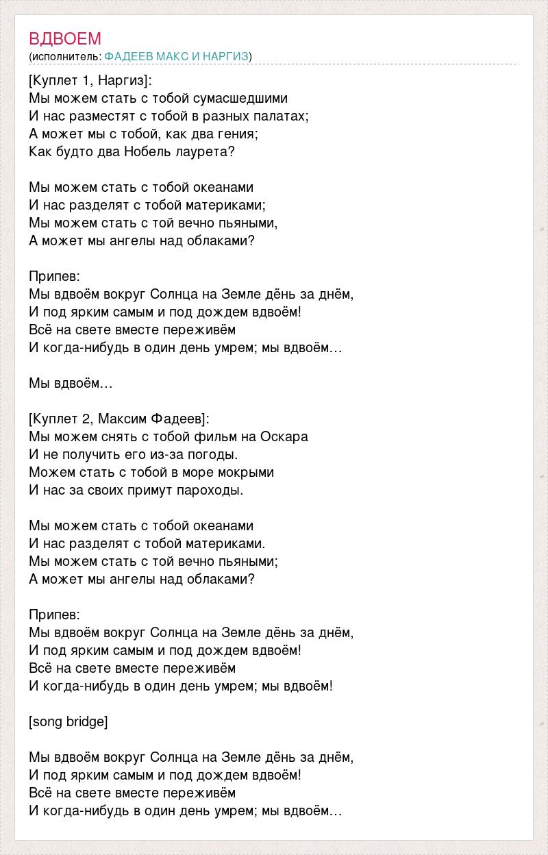 [Куплет 1, Наргиз]: Мы можем стать с тобой сумасшедшими И нас разместят с тобой в разных палатах; А может мы с тобой, как два гения; Как будто два Нобель лаурета? Мы можем стать с тобой океанами И нас разделят с тобой материками; Мы можем стать с той вечно пьяными, А может мы ангелы над облаками? Припев: Мы вдвоём вокруг Солнца на Земле дёнь за днём, И под ярким самым и под дождем вдвоём! Всё на свете вместе переживём И когда-нибудь в один день умрем; мы вдвоём… Мы вдвоём… [Куплет 2, Максим Фадеев]: Мы можем снять с тобой фильм на Оскара И не получить его из-за погоды. Можем стать с тобой в море мокрыми И нас за своих примут пароходы. Мы можем стать с тобой океанами И нас разделят с тобой материками. Мы можем стать с той вечно пьяными; А может мы ангелы над облаками? Припев: Мы вдвоём вокруг Солнца на Земле дёнь за днём, И под ярким самым и под дождем вдвоём! Всё на свете вместе переживём И когда-нибудь в один день умрем; мы вдвоём! [song bridge] Мы вдвоём вокруг Солнца на Земле дёнь за днём, И под ярким самым и под дождем вдвоём! Всё на свете вместе переживём И когда-нибудь в один день умрем; мы вдвоём…