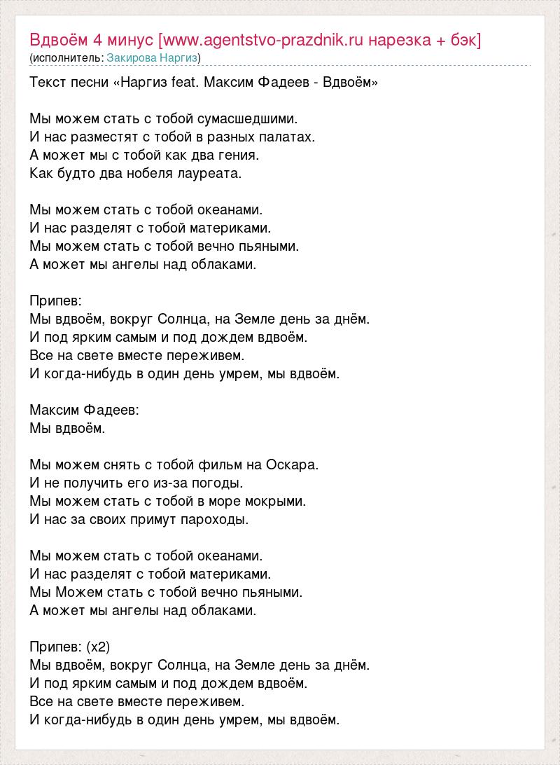 Текст песни «Наргиз feat. Максим Фадеев - Вдвоём» Мы можем стать с тобой сумасшедшими. И нас разместят с тобой в разных палатах. А может мы с тобой как два гения. Как будто два нобеля лауреата. Мы можем стать с тобой океанами. И нас разделят с тобой материками. Мы можем стать с тобой вечно пьяными. А может мы ангелы над облаками. Припев: Мы вдвоём, вокруг Солнца, на Земле день за днём. И под ярким самым и под дождем вдвоём. Все на свете вместе переживем. И когда-нибудь в один день умрем, мы вдвоём. Максим Фадеев: Мы вдвоём. Мы можем снять с тобой фильм на Оскара. И не получить его из-за погоды. Мы можем стать с тобой в море мокрыми. И нас за своих примут пароходы. Мы можем стать с тобой океанами. И нас разделят с тобой материками. Мы Можем стать с тобой вечно пьяными. А может мы ангелы над облаками. Припев: (х2) Мы вдвоём, вокруг Солнца, на Земле день за днём. И под ярким самым и под дождем вдвоём. Все на свете вместе переживем. И когда-нибудь в один день умрем, мы вдвоём.
