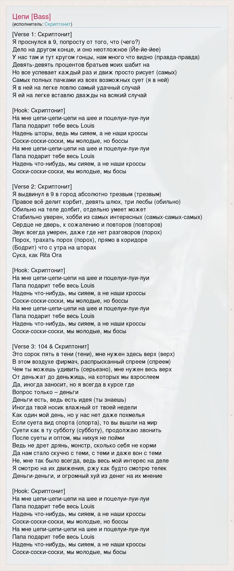 [Verse 1: Скриптонит] Я проснулся в 9, попросту от того, что (чего?) Дело на другом конце, и оно неотложное (Йе-йе-йее) У нас там и тут кругом гонцы, нам много что видно (правда-правда) Девять-девять процентов братьев моих шабит на Но все успевает каждый раз и движ просто рисует (самых) Самых полных пачками из всех возможных сует (я в ней) Я в ней на легке ловлю самый удачный случай Я ей на легке вставлю дважды на всякий случай [Hook: Скриптонит] На мне цепи-цепи-цепи на шее и поцелуи-луи-луи Папа подарит тебе весь Louis Надень шторы, ведь мы сияем, а не наши кроссы Соски-соски-соски, мы молодые, но боссы На мне цепи-цепи-цепи на шее и поцелуи-луи-луи Папа подарит тебе весь Louis Надень что-нибудь, мы сияем, а не наши кроссы Соски-соски-соски, мы молодые, мы босы [Verse 2: Скриптонит] Я выдвинул в 9 в город абсолютно трезвым (трезвым) Правое всё делит корбит, девять шлюх, три лесбы (обильно) Обильно на теле долбит, отдельно умеет может Стабильно уверен, хобби из самых интересных (самых-самых-самых) Сердце не дверь, к сожалению и повторов (повторов) Звук всегда умерен, даже где нет разговоров (порох) Порох, трахать порох (порох), прямо в коридоре (Бодрит) что с утра на шторах Сука, как Rita Ora [Hook: Скриптонит] На мне цепи-цепи-цепи на шее и поцелуи-луи-луи Папа подарит тебе весь Louis Надень что-нибудь, мы сияем, а не наши кроссы Соски-соски-соски, мы молодые, но боссы На мне цепи-цепи-цепи на шее и поцелуи-луи-луи Папа подарит тебе весь Louis Надень что-нибудь, мы сияем, а не наши кроссы Соски-соски-соски, мы молодые, мы босы [Verse 3: 104 & Скриптонит] Это сорок пять в тени (тени), мне нужен здесь верх (верх) В этом воздухе фирмач, распрысканный спреем (спреем) Чем ты можешь удивить (серьезно), мне нужен весь верх От деньжат до деньжищь, на которых мы взрослеем Да, иногда заносит, но я всегда в курсе где Вопрос только – деньги Деньги есть, ведь есть идея (ты знаешь) Иногда твой носик влажный от твоей недели Как один мой день, но у нас нет даже похмелья Если суета вид спорта (спорта), то вы вышли на мир Суети как в ту субботу (субботу), продолжаю звонить После суеты и оптом, мы нихуя не пойми Ведь не дрет дрянь, монстр, сколько себя не корми Да нам стало скучно с теми, с теми и даже вон с теми Не, мне так было всегда, ведь весь мой интерес на деле Я смотрю на их движения, ржу как будто смотрю телек Деньги-деньги, и огромный хуй из денег на их мнение [Hook: Скриптонит] На мне цепи-цепи-цепи на шее и поцелуи-луи-луи Папа подарит тебе весь Louis Надень что-нибудь, мы сияем, а не наши кроссы Соски-соски-соски, мы молодые, но боссы На мне цепи-цепи-цепи на шее и поцелуи-луи-луи Папа подарит тебе весь Louis Надень что-нибудь, мы сияем, а не наши кроссы Соски-соски-соски, мы молодые, мы босы