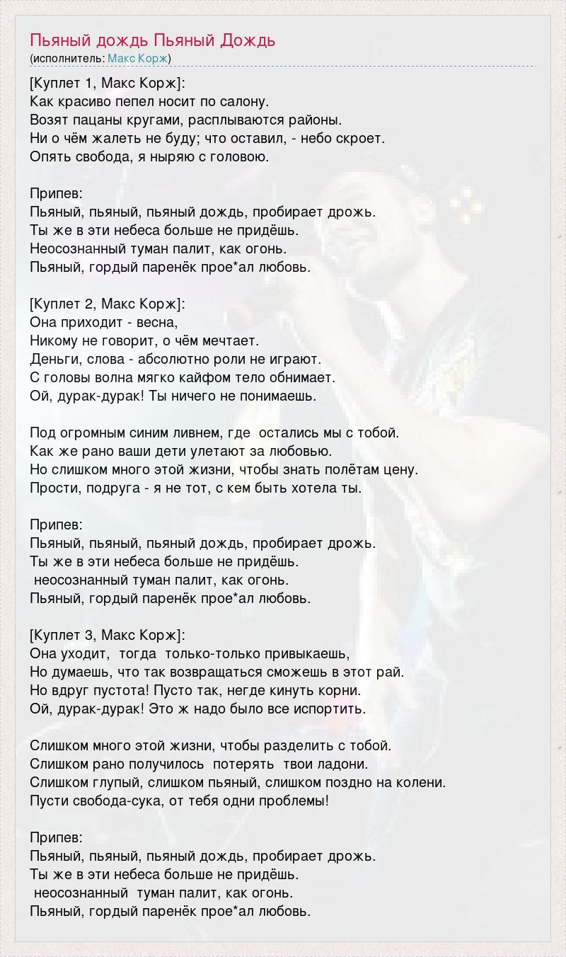 [Куплет 1, Макс Корж]: Как красиво пепел носит по салону. Возят пацаны кругами, расплываются районы. Ни о чём жалеть не буду; что оставил, - небо скроет. Опять свобода, я ныряю с головою. Припев: Пьяный, пьяный, пьяный дождь, пробирает дрожь. Ты же в эти небеса больше не придёшь. Неосознанный туман палит, как огонь. Пьяный, гордый паренёк прое*ал любовь. [Куплет 2, Макс Корж]: Она приходит - весна, Никому не говорит, о чём мечтает. Деньги, слова - абсолютно роли не играют. С головы волна мягко кайфом тело обнимает. Ой, дурак-дурак! Ты ничего не понимаешь. Под огромным синим ливнем, где остались мы с тобой. Как же рано ваши дети улетают за любовью. Но слишком много этой жизни, чтобы знать полётам цену. Прости, подруга - я не тот, с кем быть хотела ты. Припев: Пьяный, пьяный, пьяный дождь, пробирает дрожь. Ты же в эти небеса больше не придёшь. неосознанный туман палит, как огонь. Пьяный, гордый паренёк прое*ал любовь. [Куплет 3, Макс Корж]: Она уходит, тогда только-только привыкаешь, Но думаешь, что так возвращаться сможешь в этот рай. Но вдруг пустота! Пусто так, негде кинуть корни. Ой, дурак-дурак! Это ж надо было все испортить. Слишком много этой жизни, чтобы разделить с тобой. Слишком рано получилось потерять твои ладони. Слишком глупый, слишком пьяный, слишком поздно на колени. Пусти свобода-сука, от тебя одни проблемы! Припев: Пьяный, пьяный, пьяный дождь, пробирает дрожь. Ты же в эти небеса больше не придёшь. неосознанный туман палит, как огонь. Пьяный, гордый паренёк прое*ал любовь.