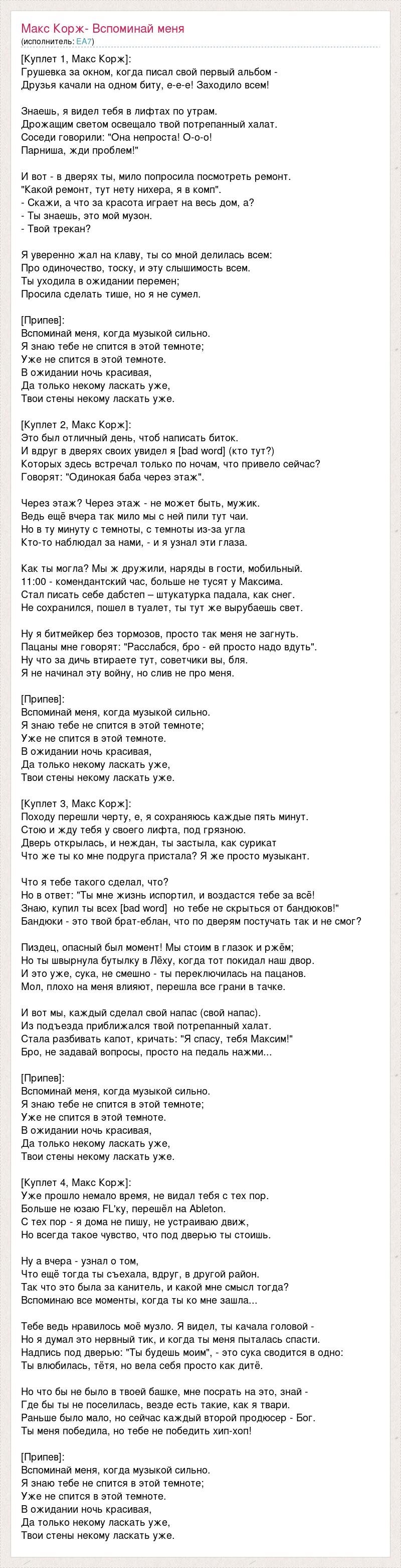 [Куплет 1, Макс Корж]: Грушевка за окном, когда писал свой первый альбом - Друзья качали на одном биту, е-е-е! Заходило всем! Знаешь, я видел тебя в лифтах по утрам. Дрожащим светом освещало твой потрепанный халат. Соседи говорили: "Она непроста! О-о-о! Парниша, жди проблем!" И вот - в дверях ты, мило попросила посмотреть ремонт. "Какой ремонт, тут нету нихера, я в комп". - Скажи, а что за красота играет на весь дом, а? - Ты знаешь, это мой музон. - Твой трекан? Я уверенно жал на клаву, ты со мной делилась всем: Про одиночество, тоску, и эту слышимость всем. Ты уходила в ожидании перемен; Просила сделать тише, но я не сумел. [Припев]: Вспоминай меня, когда музыкой сильно. Я знаю тебе не спится в этой темноте; Уже не спится в этой темноте. В ожидании ночь красивая, Да только некому ласкать уже, Твои стены некому ласкать уже. [Куплет 2, Макс Корж]: Это был отличный день, чтоб написать биток. И вдруг в дверях своих увидел я [bad word] (кто тут?) Которых здесь встречал только по ночам, что привело сейчас? Говорят: "Одинокая баба через этаж". Через этаж? Через этаж - не может быть, мужик. Ведь ещё вчера так мило мы с ней пили тут чаи. Но в ту минуту с темноты, с темноты из-за угла Кто-то наблюдал за нами, - и я узнал эти глаза. Как ты могла? Мы ж дружили, наряды в гости, мобильный. 11:00 - комендантский час, больше не тусят у Максима. Стал писать себе дабстеп – штукатурка падала, как снег. Не сохранился, пошел в туалет, ты тут же вырубаешь свет. Ну я битмейкер без тормозов, просто так меня не загнуть. Пацаны мне говорят: "Расслабся, бро - ей просто надо вдуть". Ну что за дичь втираете тут, советчики вы, бля. Я не начинал эту войну, но слив не про меня. [Припев]: Вспоминай меня, когда музыкой сильно. Я знаю тебе не спится в этой темноте; Уже не спится в этой темноте. В ожидании ночь красивая, Да только некому ласкать уже, Твои стены некому ласкать уже. [Куплет 3, Макс Корж]: Походу перешли черту, е, я сохраняюсь каждые пять минут. Стою и жду тебя у своего лифта, под грязною. Дверь открылась, и неждан, ты застыла, как сурикат Что же ты ко мне подруга пристала? Я же просто музыкант. Что я тебе такого сделал, что? Но в ответ: "Ты мне жизнь испортил, и воздастся тебе за всё! Знаю, купил ты всех [bad word] но тебе не скрыться от бандюков!" Бандюки - это твой брат-еблан, что по дверям постучать так и не смог? Пиздец, опасный был момент! Мы стоим в глазок и ржём; Но ты швырнула бутылку в Лёху, когда тот покидал наш двор. И это уже, сука, не смешно - ты переключилась на пацанов. Мол, плохо на меня влияют, перешла все грани в тачке. И вот мы, каждый сделал свой напас (свой напас). Из подъезда приближался твой потрепанный халат. Стала разбивать капот, кричать: "Я спасу, тебя Максим!" Бро, не задавай вопросы, просто на педаль нажми... [Припев]: Вспоминай меня, когда музыкой сильно. Я знаю тебе не спится в этой темноте; Уже не спится в этой темноте. В ожидании ночь красивая, Да только некому ласкать уже, Твои стены некому ласкать уже. [Куплет 4, Макс Корж]: Уже прошло немало время, не видал тебя с тех пор. Больше не юзаю FL'ку, перешёл на Ableton. С тех пор - я дома не пишу, не устраиваю движ, Но всегда такое чувство, что под дверью ты стоишь. Ну а вчера - узнал о том, Что ещё тогда ты съехала, вдруг, в другой район. Так что это была за канитель, и какой мне смысл тогда? Вспоминаю все моменты, когда ты ко мне зашла... Тебе ведь нравилось моё музло. Я видел, ты качала головой - Но я ду