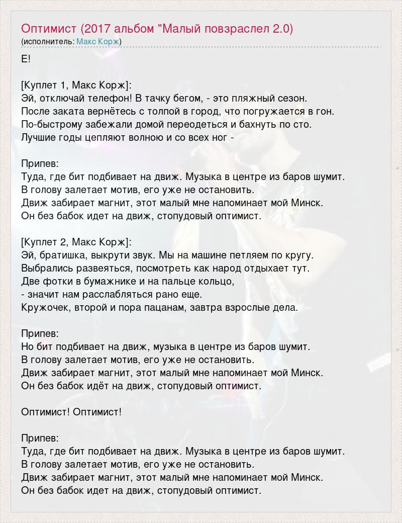 Е! [Куплет 1, Макс Корж]: Эй, отключай телефон! В тачку бегом, - это пляжный сезон. После заката вернётесь с толпой в город, что погружается в гон. По-быстрому забежали домой переодеться и бахнуть по сто. Лучшие годы цепляют волною и со всех ног - Припев: Туда, где бит подбивает на движ. Музыка в центре из баров шумит. В голову залетает мотив, его уже не остановить. Движ забирает магнит, этот малый мне напоминает мой Минск. Он без бабок идет на движ, стопудовый оптимист. [Куплет 2, Макс Корж]: Эй, братишка, выкрути звук. Мы на машине петляем по кругу. Выбрались развеяться, посмотреть как народ отдыхает тут. Две фотки в бумажнике и на пальце кольцо, - значит нам расслабляться рано еще. Кружочек, второй и пора пацанам, завтра взрослые дела. Припев: Но бит подбивает на движ, музыка в центре из баров шумит. В голову залетает мотив, его уже не остановить. Движ забирает магнит, этот малый мне напоминает мой Минск. Он без бабок идёт на движ, стопудовый оптимист. Оптимист! Оптимист! Припев: Туда, где бит подбивает на движ. Музыка в центре из баров шумит. В голову залетает мотив, его уже не остановить. Движ забирает магнит, этот малый мне напоминает мой Минск. Он без бабок идет на движ, стопудовый оптимист.