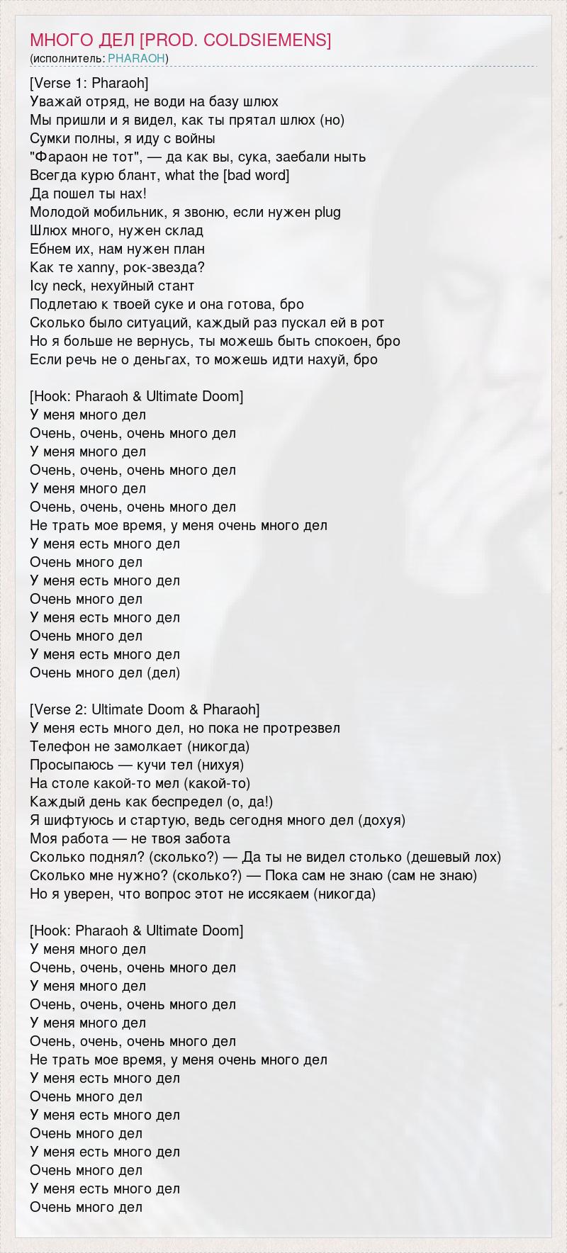 [Verse 1: Pharaoh] Уважай отряд, не води на базу шлюх Мы пришли и я видел, как ты прятал шлюх (но) Сумки полны, я иду с войны "Фараон не тот", — да как вы, сука, заебали ныть Всегда курю блант, what the [bad word] Да пошел ты нах! Молодой мобильник, я звоню, если нужен plug Шлюх много, нужен склад Ебнем их, нам нужен план Как те xanny, рок-звезда? Icy neck, нехуйный стант Подлетаю к твоей суке и она готова, бро Сколько было ситуаций, каждый раз пускал ей в рот Но я больше не вернусь, ты можешь быть спокоен, бро Если речь не о деньгах, то можешь идти нахуй, бро [Hook: Pharaoh & Ultimate Doom] У меня много дел Очень, очень, очень много дел У меня много дел Очень, очень, очень много дел У меня много дел Очень, очень, очень много дел Не трать мое время, у меня очень много дел У меня есть много дел Очень много дел У меня есть много дел Очень много дел У меня есть много дел Очень много дел У меня есть много дел Очень много дел (дел) [Verse 2: Ultimate Doom & Pharaoh] У меня есть много дел, но пока не протрезвел Телефон не замолкает (никогда) Просыпаюсь — кучи тел (нихуя) На столе какой-то мел (какой-то) Каждый день как беспредел (о, да!) Я шифтуюсь и стартую, ведь сегодня много дел (дохуя) Моя работа — не твоя забота Сколько поднял? (сколько?) — Да ты не видел столько (дешевый лох) Сколько мне нужно? (сколько?) — Пока сам не знаю (сам не знаю) Но я уверен, что вопрос этот не иссякаем (никогда) [Hook: Pharaoh & Ultimate Doom] У меня много дел Очень, очень, очень много дел У меня много дел Очень, очень, очень много дел У меня много дел Очень, очень, очень много дел Не трать мое время, у меня очень много дел У меня есть много дел Очень много дел У меня есть много дел Очень много дел У меня есть много дел Очень много дел У меня есть много дел Очень много дел