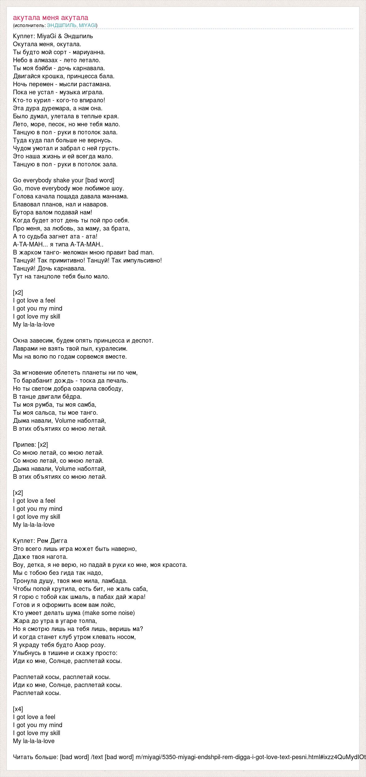 Куплет: MiyaGi & Эндшпиль Окутала меня, окутала. Ты будто мой сорт - мариуанна. Небо в алмазах - лето летало. Ты моя бэйби - дочь карнавала. Двигайся крошка, принцесса бала. Ночь перемен - мысли растамана. Пока не устал - музыка играла. Кто-то курил - кого-то впирало! Эта дура дуремара, а нам она. Было думал, улетала в теплые края. Лето, море, песок, но мне тебя мало. Танцую в пол - руки в потолок зала. Туда куда пал больше не вернусь. Чудом умотал и забрал с ней грусть. Это наша жизнь и ей всегда мало. Танцую в пол - руки в потолок зала. Go everybody shake your [bad word] Go, move everybody мое любимое шоу. Голова качала пощада давала маннама. Блавовал планов, нал и наваров. Бутора валом подавай нам! Когда будет этот день ты пой про себя. Про меня, за любовь, за маму, за брата, А то судьба загнет ата - ата! А-ТА-МАН... я типа А-ТА-МАН.. В жарком танго- меломан мною правит bad man. Танцуй! Так примитивно! Танцуй! Так импульсивно! Танцуй! Дочь карнавала. Тут на танцполе тебя было мало. [x2] I got love a feel I got you my mind I got love my skill My la-la-la-love Окна завесим, будем опять принцесса и деспот. Лаврами не взять твой пыл, куралесим. Мы на волю по годам сорвемся вместе. За мгновение облететь планеты ни по чем, То барабанит дождь - тоска да печаль. Но ты светом добра озарила свободу, В танце двигали бёдра. Ты моя румба, ты моя самба, Ты моя сальса, ты мое танго. Дыма навали, Volume наболтай, В этих объятиях со мною летай. Припев: [х2] Со мною летай, со мною летай. Со мною летай, со мною летай. Дыма навали, Volume наболтай, В этих объятиях со мною летай. [х2] I got love a feel I got you my mind I got love my skill My la-la-la-love Куплет: Рем Дигга Это всего лишь игра может быть наверно, Даже твоя нагота. Воу, детка, я не верю, но падай в руки ко мне, моя красота. Мы с тобою без гида так надо, Тронула душу, твоя мне мила, ламбада. Чтобы попой крутила, есть бит, не жаль саба, Я горю с тобой как шмаль, в пабах дай жара! Готов и я оформить всем вам лойс, Кто умеет делать шума (make some noise) Жара до утра в угаре толпа, Но я смотрю лишь на тебя лишь, веришь ма? И когда станет клуб утром клевать носом, Я украду тебя будто Азор розу. Улыбнусь в тишине и скажу просто: Иди ко мне, Солнце, расплетай косы. Расплетай косы, расплетай косы. Иди ко мне, Солнце, расплетай косы. Расплетай косы. [x4] I got love a feel I got you my mind I got love my skill My la-la-la-love Читать больше: [bad word] /text [bad word] m/miyagi/5350-miyagi-endshpil-rem-digga-i-got-love-text-pesni.html#ixzz4QuMydIOt