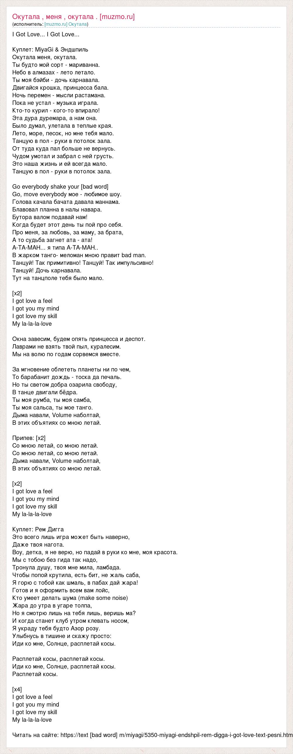 I Got Love... I Got Love... Куплет: MiyaGi & Эндшпиль Окутала меня, окутала. Ты будто мой сорт - мариванна. Небо в алмазах - лето летало. Ты моя бэйби - дочь карнавала. Двигайся крошка, принцесса бала. Ночь перемен - мысли растамана. Пока не устал - музыка играла. Кто-то курил - кого-то впирало! Эта дура дуремара, а нам она. Было думал, улетала в теплые края. Лето, море, песок, но мне тебя мало. Танцую в пол - руки в потолок зала. От туда куда пал больше не вернусь. Чудом умотал и забрал с ней грусть. Это наша жизнь и ей всегда мало. Танцую в пол - руки в потолок зала. Go everybody shake your [bad word] Go, move everybody мое - любимое шоу. Голова качала бачата давала маннама. Блавовал планна в налы навара. Бутора валом подавай нам! Когда будет этот день ты пой про себя. Про меня, за любовь, за маму, за брата, А то судьба загнет ата - ата! А-ТА-МАН... я типа А-ТА-МАН.. В жарком танго- меломан мною правит bad man. Танцуй! Так примитивно! Танцуй! Так импульсивно! Танцуй! Дочь карнавала. Тут на танцполе тебя было мало. [x2] I got love a feel I got you my mind I got love my skill My la-la-la-love Окна завесим, будем опять принцесса и деспот. Лаврами не взять твой пыл, куралесим. Мы на волю по годам сорвемся вместе. За мгновение облететь планеты ни по чем, То барабанит дождь - тоска да печаль. Но ты светом добра озарила свободу, В танце двигали бёдра. Ты моя румба, ты моя самба, Ты моя сальса, ты мое танго. Дыма навали, Volume наболтай, В этих объятиях со мною летай. Припев: [х2] Со мною летай, со мною летай. Со мною летай, со мною летай. Дыма навали, Volume наболтай, В этих объятиях со мною летай. [х2] I got love a feel I got you my mind I got love my skill My la-la-la-love Куплет: Рем Дигга Это всего лишь игра может быть наверно, Даже твоя нагота. Воу, детка, я не верю, но падай в руки ко мне, моя красота. Мы с тобою без гида так надо, Тронула душу, твоя мне мила, ламбада. Чтобы попой крутила, есть бит, не жаль саба, Я горю с тобой как шмаль, в пабах дай жара! Готов и я оформить всем вам лойс, Кто умеет делать шума (make some noise) Жара до утра в угаре толпа, Но я смотрю лишь на тебя лишь, веришь ма? И когда станет клуб утром клевать носом, Я украду тебя будто Азор розу. Улыбнусь в тишине и скажу просто: Иди ко мне, Солнце, расплетай косы. Расплетай косы, расплетай косы. Иди ко мне, Солнце, расплетай косы. Расплетай косы. [x4] I got love a feel I got you my mind I got love my skill My la-la-la-love Читать на сайте: https://text [bad word] m/miyagi/5350-miyagi-endshpil-rem-digga-i-got-love-text-pesni.htm
