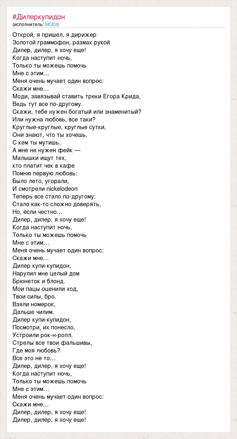Открой, я пришел, я дирижер Золотой граммофон, размах рукой Дилер, дилер, я хочу еще! Когда наступит ночь, Только ты можешь помочь Мне с этим… Меня очень мучает один вопрос: Скажи мне… Моди, завязывай ставить треки Егора Крида, Ведь тут все по-другому. Скажи, тебе нужен богатый или знаменитый? Или нужна любовь, все таки? Круглые-круглые, круглые сутки, Они знают, что ты хочешь, С кем ты мутишь. А мне не нужен фейк — Малышки ищут тех, кто платит чек в кафе Помню первую любовь: Было лето, угорали, И смотрели nickelodeon Теперь все стало по-другому: Стало как-то сложно доверять, Но, если честно… Дилер, дилер, я хочу еще! Когда наступит ночь, Только ты можешь помочь Мне с этим… Меня очень мучает один вопрос: Скажи мне… Дилер купи-купидон, Нарулил мне целый дом Брюнеток и блонд. Мои пацы оценили ход, Твои силы, бро. Взяли номерок, Дальше чилим. Дилер купи-купидон, Посмотри, их понесло, Устроили рок-н-ролл. Стрелы все твои фальшивы, Где моя любовь? Все это не то… Дилер, дилер, я хочу еще! Когда наступит ночь, Только ты можешь помочь Мне с этим… Меня очень мучает один вопрос: Скажи мне… Дилер, дилер, я хочу еще! Дилер, дилер, я хочу еще!