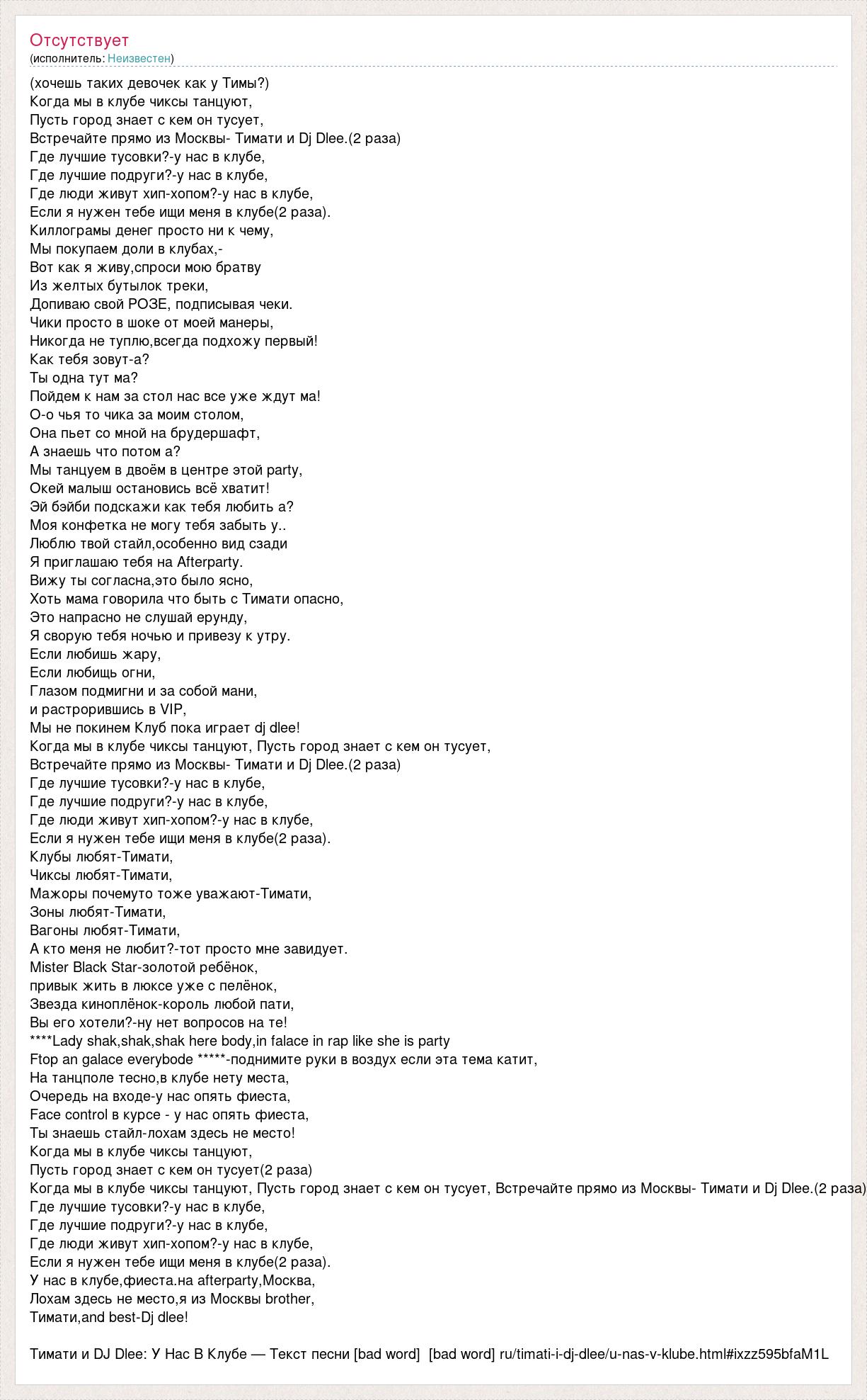 (хочешь таких девочек как у Тимы?) Когда мы в клубе чиксы танцуют, Пусть город знает с кем он тусует, Встречайте прямо из Москвы- Тимати и Dj Dlee.(2 раза) Где лучшие тусовки?-у нас в клубе, Где лучшие подруги?-у нас в клубе, Где люди живут хип-хопом?-у нас в клубе, Если я нужен тебе ищи меня в клубе(2 раза). Киллограмы денег просто ни к чему, Мы покупаем доли в клубах,- Вот как я живу,спроси мою братву Из желтых бутылок треки, Допиваю свой РОЗЕ, подписывая чеки. Чики просто в шоке от моей манеры, Никогда не туплю,всегда подхожу первый! Как тебя зовут-а? Ты одна тут ма? Пойдем к нам за стол нас все уже ждут ма! О-о чья то чика за моим столом, Она пьет со мной на брудершафт, А знаешь что потом а? Мы танцуем в двоём в центре этой party, Окей малыш остановись всё хватит! Эй бэйби подскажи как тебя любить а? Моя конфетка не могу тебя забыть у.. Люблю твой стайл,особенно вид сзади Я приглашаю тебя на Аfterparty. Вижу ты согласна,это было ясно, Хоть мама говорила что быть с Тимати опасно, Это напрасно не слушай ерунду, Я сворую тебя ночью и привезу к утру. Если любишь жару, Если любищь огни, Глазом подмигни и за собой мани, и растрорившись в VIP, Мы не покинем Клуб пока играет dj dlee! Когда мы в клубе чиксы танцуют, Пусть город знает с кем он тусует, Встречайте прямо из Москвы- Тимати и Dj Dlee.(2 раза) Где лучшие тусовки?-у нас в клубе, Где лучшие подруги?-у нас в клубе, Где люди живут хип-хопом?-у нас в клубе, Если я нужен тебе ищи меня в клубе(2 раза). Клубы любят-Тимати, Чиксы любят-Тимати, Мажоры почемуто тоже уважают-Тимати, Зоны любят-Тимати, Вагоны любят-Тимати, А кто меня не любит?-тот просто мне завидует. Мister Black Star-золотой ребёнок, привык жить в люксе уже с пелёнок, Звезда киноплёнок-король любой пати, Вы его хотели?-ну нет вопросов на те! ****Lady shak,shak,shak here body,in falace in rap like she is party Ftop an galace everybode *****-поднимите руки в воздух если эта тема катит, На танцполе тесно,в клубе нету места, Очередь на входе-у нас опять фиеста, Face control в курсе - у нас опять фиеста, Ты знаешь стайл-лохам здесь не место! Когда мы в клубе чиксы танцуют, Пусть город знает с кем он тусует(2 раза) Когда мы в клубе чиксы танцуют, Пусть город знает с кем он тусует, Встречайте прямо из Москвы- Тимати и Dj Dlee.(2 раза) Где лучшие тусовки?-у нас в клубе, Где лучшие подруги?-у нас в клубе, Где люди живут хип-хопом?-у нас в клубе, Если я нужен тебе ищи меня в клубе(2 раза). У нас в клубе,фиеста.на afterparty,Москва, Лохам здесь не место,я из Москвы brother, Тимати,and best-Dj dlee! Тимати и DJ Dlee: У Нас В Клубе — Текст песни [bad word] [bad word] ru/timati-i-dj-dlee/u-nas-v-klube.html#ixzz595bfaM1L