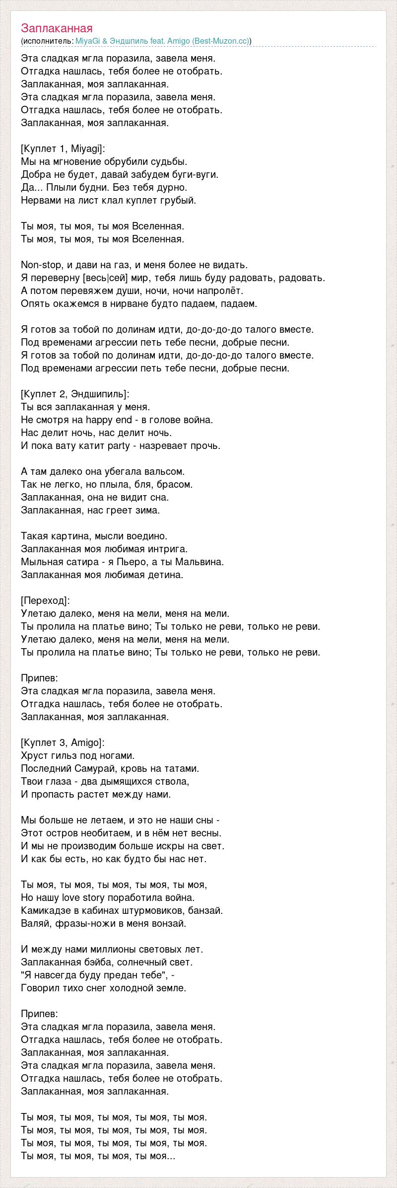Эта сладкая мгла поразила, завела меня. Отгадка нашлась, тебя более не отобрать. Заплаканная, моя заплаканная. Эта сладкая мгла поразила, завела меня. Отгадка нашлась, тебя более не отобрать. Заплаканная, моя заплаканная. [Куплет 1, Miyagi]: Мы на мгновение обрубили судьбы. Добра не будет, давай забудем буги-вуги. Да... Плыли будни. Без тебя дурно. Нервами на лист клал куплет грубый. Ты моя, ты моя, ты моя Вселенная. Ты моя, ты моя, ты моя Вселенная. Non-stop, и дави на газ, и меня более не видать. Я переверну [весь|сей] мир, тебя лишь буду радовать, радовать. А потом перевяжем души, ночи, ночи напролёт. Опять окажемся в нирване будто падаем, падаем. Я готов за тобой по долинам идти, до-до-до-до талого вместе. Под временами агрессии петь тебе песни, добрые песни. Я готов за тобой по долинам идти, до-до-до-до талого вместе. Под временами агрессии петь тебе песни, добрые песни. [Куплет 2, Эндшипиль]: Ты вся заплаканная у меня. Не смотря на happy end - в голове война. Нас делит ночь, нас делит ночь. И пока вату катит party - назревает прочь. А там далеко она убегала вальсом. Так не легко, но плыла, бля, брасом. Заплаканная, она не видит сна. Заплаканная, нас греет зима. Такая картина, мысли воедино. Заплаканная моя любимая интрига. Мыльная сатира - я Пьеро, а ты Мальвина. Заплаканная моя любимая детина. [Переход]: Улетаю далеко, меня на мели, меня на мели. Ты пролила на платье вино; Ты только не реви, только не реви. Улетаю далеко, меня на мели, меня на мели. Ты пролила на платье вино; Ты только не реви, только не реви. Припев: Эта сладкая мгла поразила, завела меня. Отгадка нашлась, тебя более не отобрать. Заплаканная, моя заплаканная. [Куплет 3, Amigo]: Хруст гильз под ногами. Последний Самурай, кровь на татами. Твои глаза - два дымящихся ствола, И пропасть растет между нами. Мы больше не летаем, и это не наши сны - Этот остров необитаем, и в нём нет весны. И мы не производим больше искры на свет. И как бы есть, но как будто бы нас нет. Ты моя, ты моя, ты моя, ты моя, ты моя, Но нашу love story поработила война. Камикадзе в кабинах штурмовиков, банзай. Валяй, фразы-ножи в меня вонзай. И между нами миллионы световых лет. Заплаканная бэйба, солнечный свет. "Я навсегда буду предан тебе", - Говорил тихо снег холодной земле. Припев: Эта сладкая мгла поразила, завела меня. Отгадка нашлась, тебя более не отобрать. Заплаканная, моя заплаканная. Эта сладкая мгла поразила, завела меня. Отгадка нашлась, тебя более не отобрать. Заплаканная, моя заплаканная. Ты моя, ты моя, ты моя, ты моя, ты моя. Ты моя, ты моя, ты моя, ты моя, ты моя. Ты моя, ты моя, ты моя, ты моя, ты моя. Ты моя, ты моя, ты моя, ты моя...