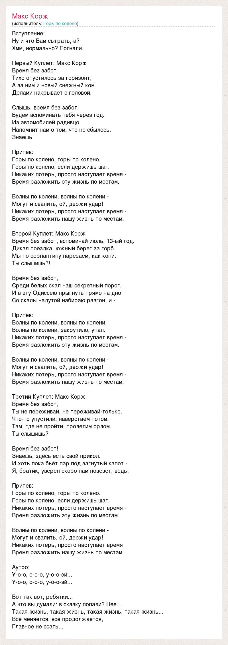 Вступление: Ну и что Вам сыграть, а? Хмм, нормально? Погнали. Первый Куплет: Макс Корж Время без забот Тихо опустилось за горизонт, А за ним и новый снежный ком Делами накрывает с головой. Слышь, время без забот, Будем вспоминать тебя через год. Из автомобилей радивцо Напомнит нам о том, что не сбылось. Знаешь Припев: Горы по колено, горы по колено. Горы по колено, если держишь шаг. Никаких потерь, просто наступает время - Время разложить эту жизнь по местам. Волны по колени, волны по колени - Могут и свалить, ой, держи удар! Никаких потерь, просто наступает время - Время разложить нашу жизнь по местам. Второй Куплет: Макс Корж Время без забот, вспоминай июль, 13-ый год. Дикая поездка, южный берег за горб. Мы по серпантину нарезаем, как кони. Ты слышишь?! Время без забот, Среди белых скал наш секретный порог. И в эту Одиссею прыгнуть прямо на дно Со скалы надутой набираю разгон, и - Припев: Волны по колени, волны по колени, Волны по колени, закрутило, упал. Никаких потерь, просто наступает время - Время разложить эту жизнь по местам. Волны по колени, волны по колени - Могут и свалить, ой, держи удар! Никаких потерь, просто наступает время - Время разложить нашу жизнь по местам. Третий Куплет: Макс Корж Время без забот, Ты не переживай, не переживай-только. Что-то упустили, наверстаем потом. Там, где не пройти, пролетим орлом. Ты слышишь? Время без забот! Знаешь, здесь есть свой прикол. И хоть пока бьёт пар под загнутый капот - Я, братик, уверен скоро нам повезет, ведь: Припев: Горы по колено, горы по колено. Горы по колено, если держишь шаг. Никаких потерь, просто наступает время - Время разложить эту жизнь по местам. Волны по колени, волны по колени - Могут и свалить, ой, держи удар! Никаких потерь, просто наступает время Время разложить нашу жизнь по местам. Аутро: У-о-о, о-о-о, у-о-о-эй... У-о-о, о-о-о, у-о-о-эй... Вот так вот, ребятки... А что вы думали: в сказку попали? Нее... Такая жизнь, такая жизнь, такая жизнь, такая жизнь... Всё меняется, всё продолжается, Главное не ссать...
